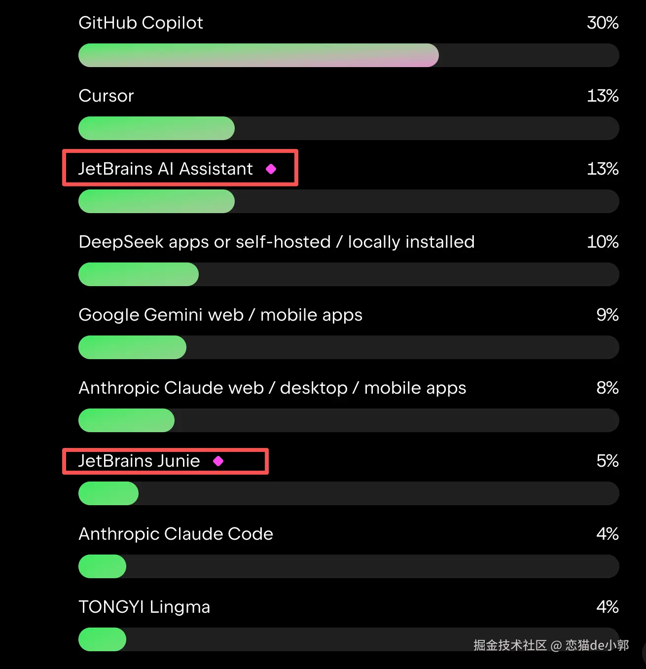 但是根据 JetBrains 自己 2025 数据,Copilot 和 Cursur 在 AI 赶上或者超过 JetBrains AI Assistant ,而主推的 Junie Agent 更是只有 5%: