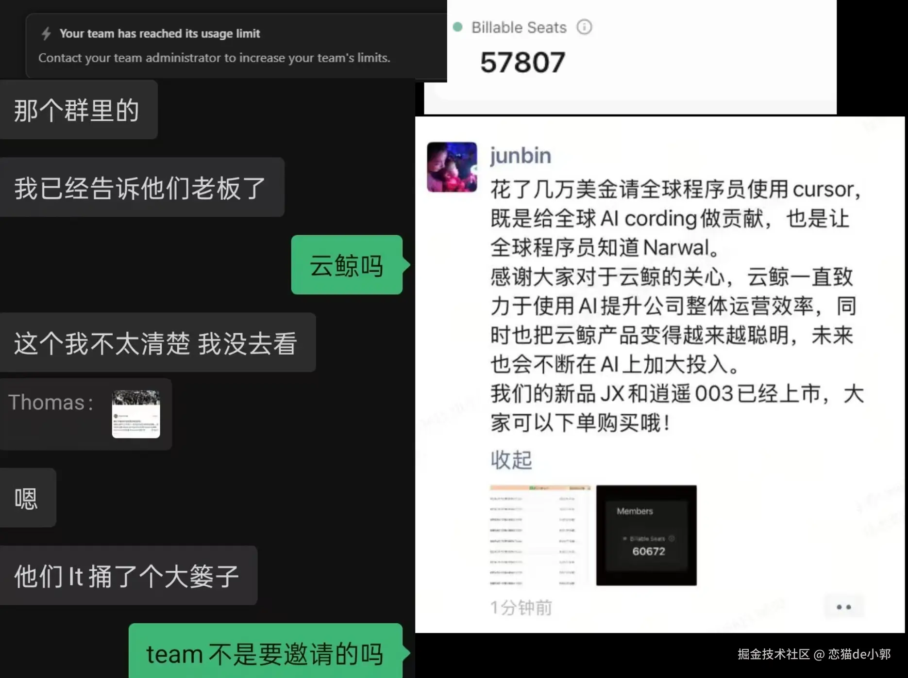 聊之前我们先说点前言,之所以会有这个思考,其实也是来自近日的「云鲸 Cursor Team 邀请泄漏 」事件,云鲸在企业内部应该是有 Cursor 的大规模使用,然后某个 Seat 邀请链接泄漏,导致几万人涌进云鲸的 Cursor Team ,短短一会就消耗了几万美金,最终负责人表示这个钱就当是做广告了。