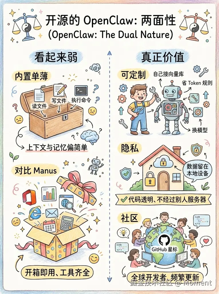 上图左边是开源带来的"看起来能力弱":内置工具少、逻辑薄,和商业版 Manus 一对比尤其明显。右边是开源带来的真正价值:可定制、数据在自己手里、还有社区一起迭代。