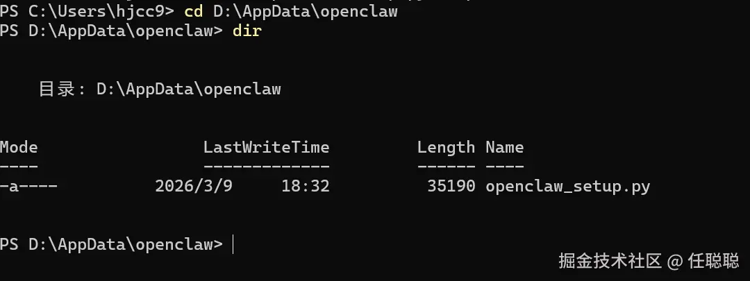 然后切换到这个目录: cd /d D:\AppData\openclaw