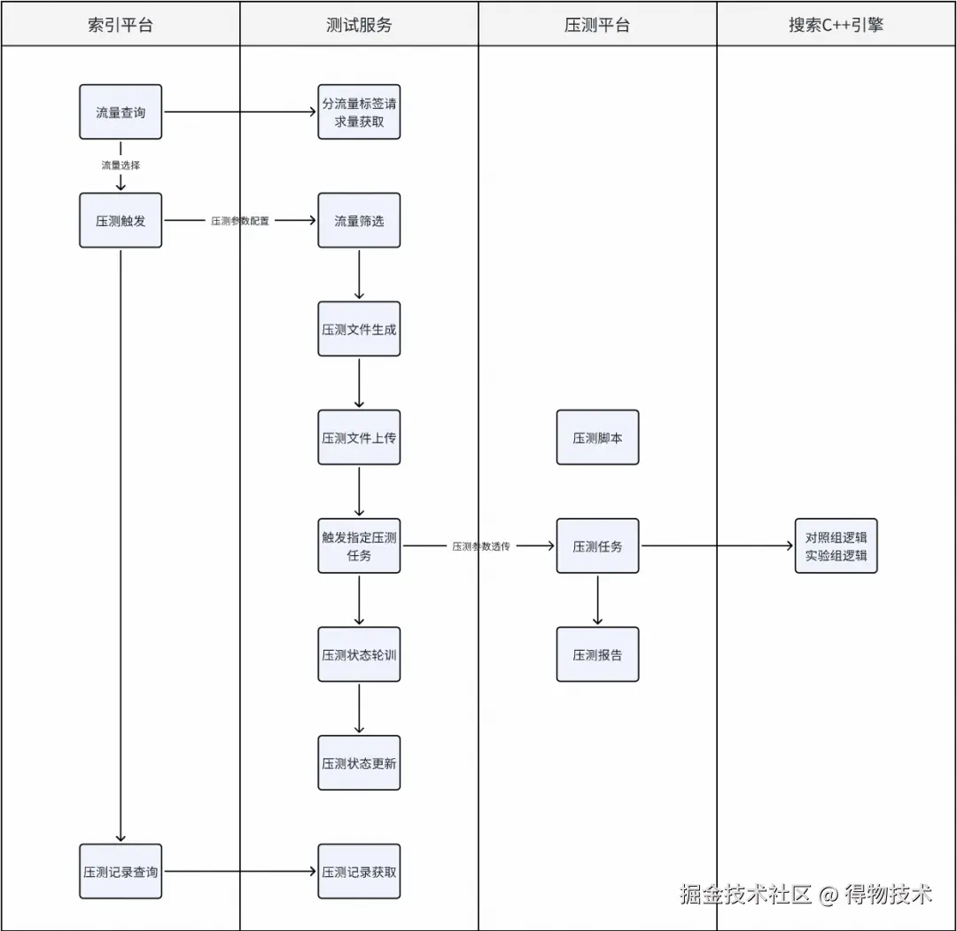 - 测试服务提供索引平台操作的接口能力,查询流量->流量筛选->压测文件生成->压测任务触发->压测状态更新。