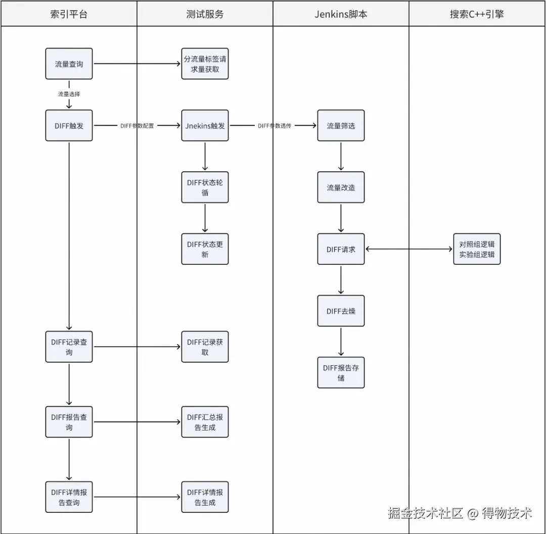 DIFF 的入口统一在索引平台:查询流量 →选择流量→配置参数→触发 DIFF→查看报告。底层由测试服务 + 脚本完成:流量筛选与改造、请求转发、去噪、报告生成与存储。