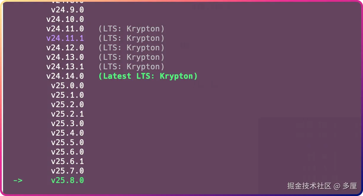 可以看目前有哪些可用版本可安装,在版本号前面的 -> 箭头符号代表目前 nvm 正在使用的 Node.js 版本: