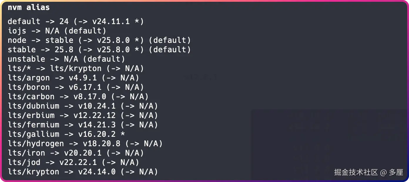 接著用 nvm alias 指令就會看到刚刚新增的別名所对应的 Node.js 版本:SHELL