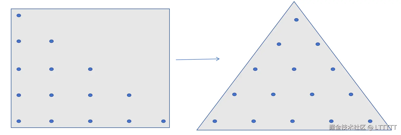 接下来的问题就是,为了存储以及让GPU高效访问顶点信息,到底应该使用什么坐标能唯一标识20面体的一个几何面 的三角形网格的每个网格顶点 (暂不考虑20面体的每个几何面的相邻顶点的重叠),一开始这个问题让我考虑了很久。 最简单的想法是,每个几何面都是等边三角形,那自然可以把一张2d贴图的左边一半一一对应到右边,也就是(0,0)就对应下图等边三角形的左下角,(4,0)代表右下角,但使用这种索引方式,存储时必然会浪费一半的空间。而且在语义上来说,三角形的三个顶点就不平等了,表达"向右上方前进一步"、"向左下方前进一步"时,必然有不少歧义。
