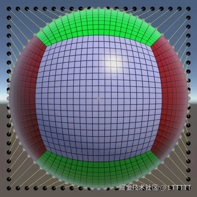 (1)cubeSphere,把一个正方体的表面的每个网格顶点映射到球面上,作为四叉树LOD地形的网格的优点是细分的逻辑可以复用平面地形的四叉树细分逻辑,然而缺点是作为一个星球的网格,在正方体的几何顶点附近会发生很大的畸变,如图。