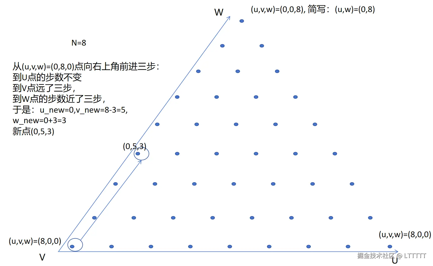 比如:从(u,v,w)=(0,8,0)点向右上角前进三步,由于到U点的步数不变,到V点远了三步,到W点的步数近了三步,于是有:u_new=0,v_new=8-3=5,w_new=0+3=3,目标点为(0,5,3)