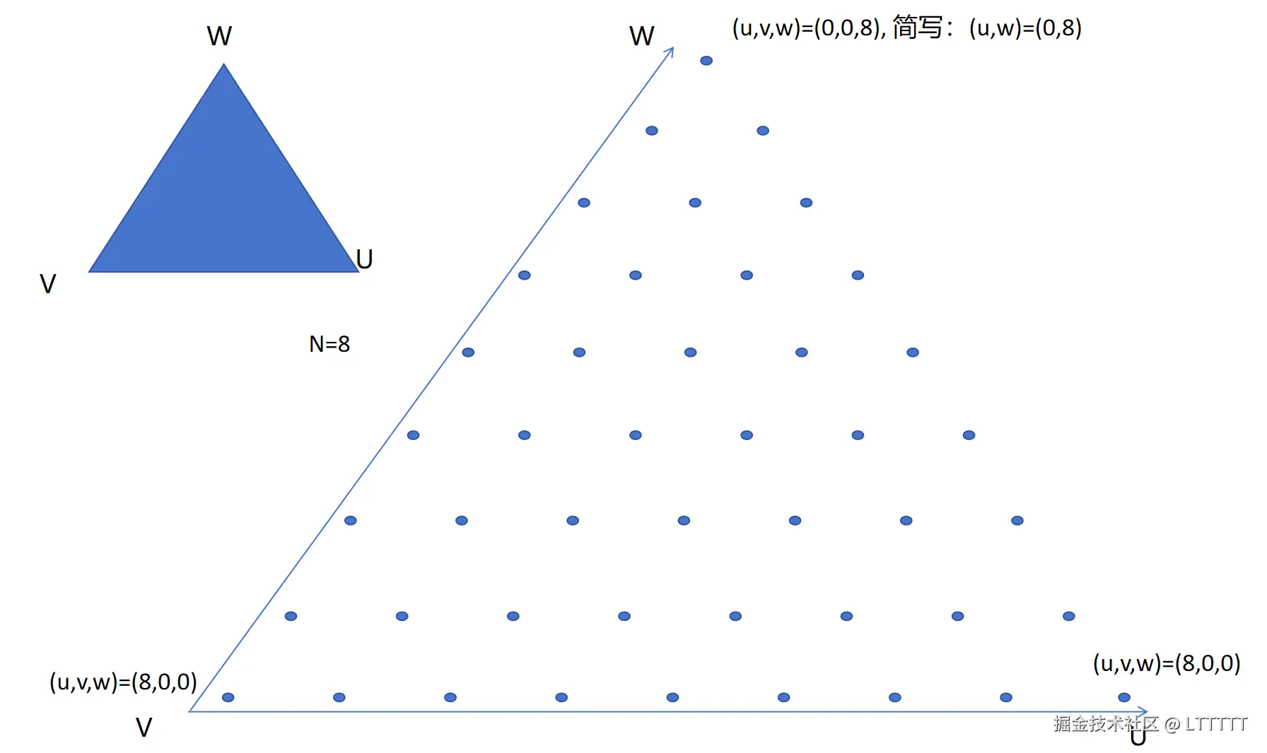 考虑每个几何面都是等边三角形,再考虑到等边三角形上使用重心坐标有不少良好的性质,比如旋转对称性,决定使用重心坐标。按照顺时针从右下角开始给每个几何顶点分别命名为U、V、W 一般数学上的重心坐标 都是u+v+w=1。但为了计算精确,可以直接两边乘以三角形的细分段数N,从而:u+v+w=N,其中u、v、w都变成了整数,我暂且称这种表示方法为整数重心坐标,我不知道是不是有更好的说法,于是如下图所示,每个点都可以使用整数重心坐标表示出来。 在u+v+w=N这个约束条件下,实际上每个(u,v,w)=(0,0,8),在程序中存储的时候实际上也可以简写成(u,w)=(0,8),大大方便了计算。
