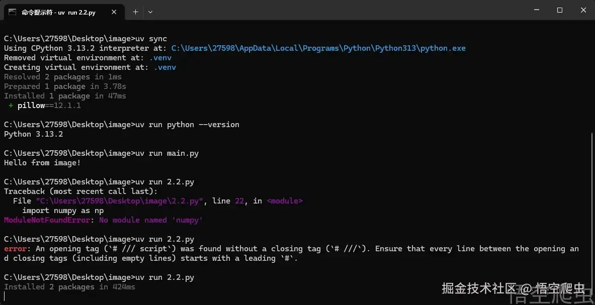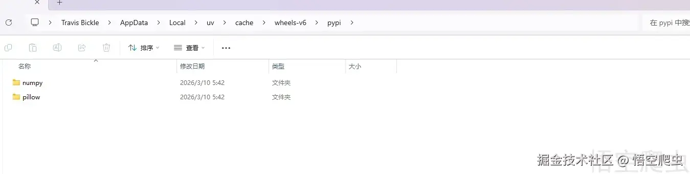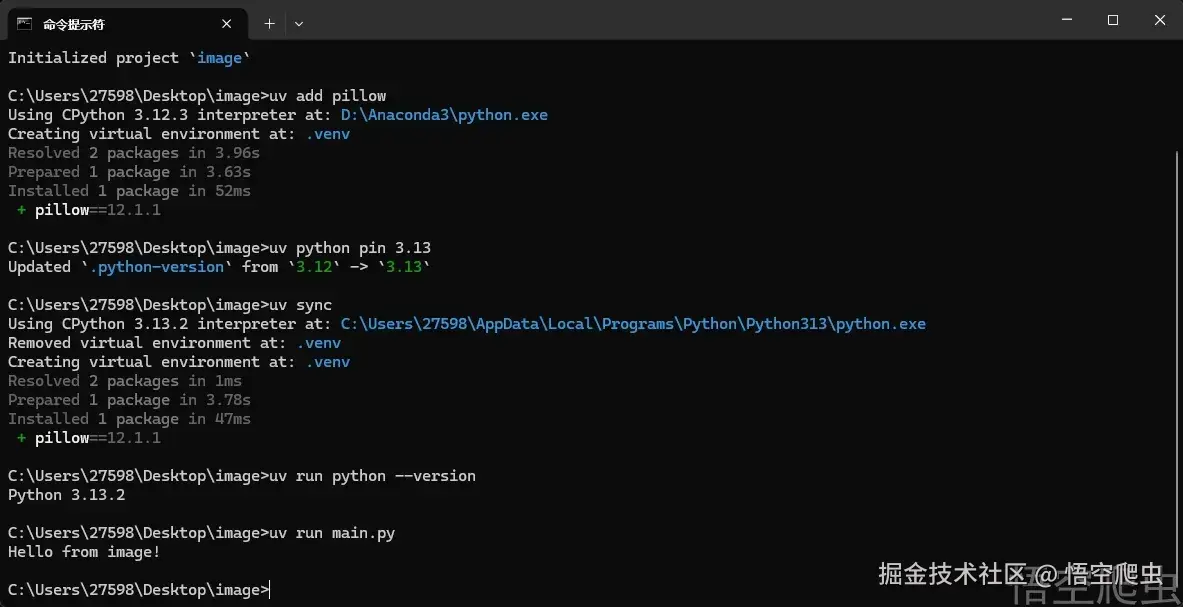 uv add pillow时,uv会自动把pillow写进这个文件里。以后你把项目发给别人,别人只需要运行uv sync,uv就会根据这个文件里的清单,把所有的包原封不动地装好。