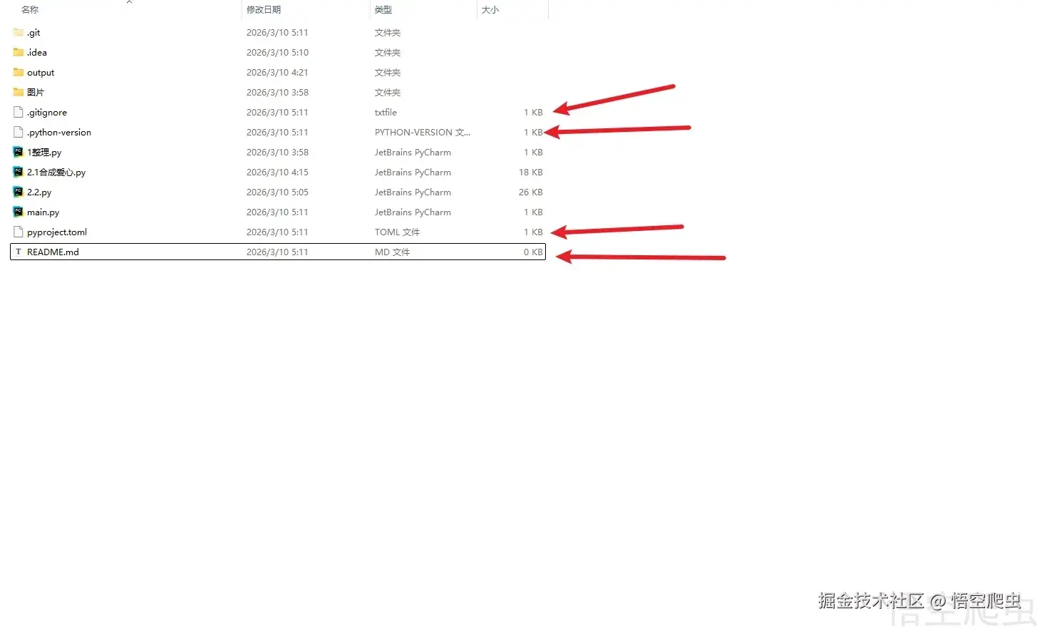 uv自动帮你写好了规则。它会忽略.venv(虚拟环境文件夹)。因为虚拟环境很大且因人而异,我们通常只分享代码和配置文件(如pyproject.toml),让别人在自己电脑上重新生成环境。