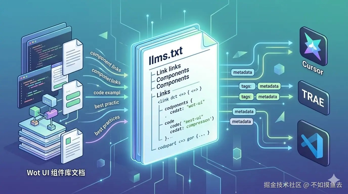 llms.txt 是一个专为大型语言模型(Large Language Models,简称 LLMs)设计的文本文件,类似于 robots.txt,但目的不同。robots.txt 告诉搜索引擎爬虫哪些页面可以爬取,而 llms.txt 则是为 AI 工具提供网站内容的结构化信息,帮助 AI 更好地理解和索引网站内容。llms.txt 的名称中的 "llms" 代表 "Large Language Models",表明这个文件是专门为大型语言模型设计的。它包含了项目的关键文档链接、代码示例和最佳实践,能够帮助 VSCode、Cursor、TRAE、Antigravity 等 AI 工具更好地理解 Wot UI 组件库。