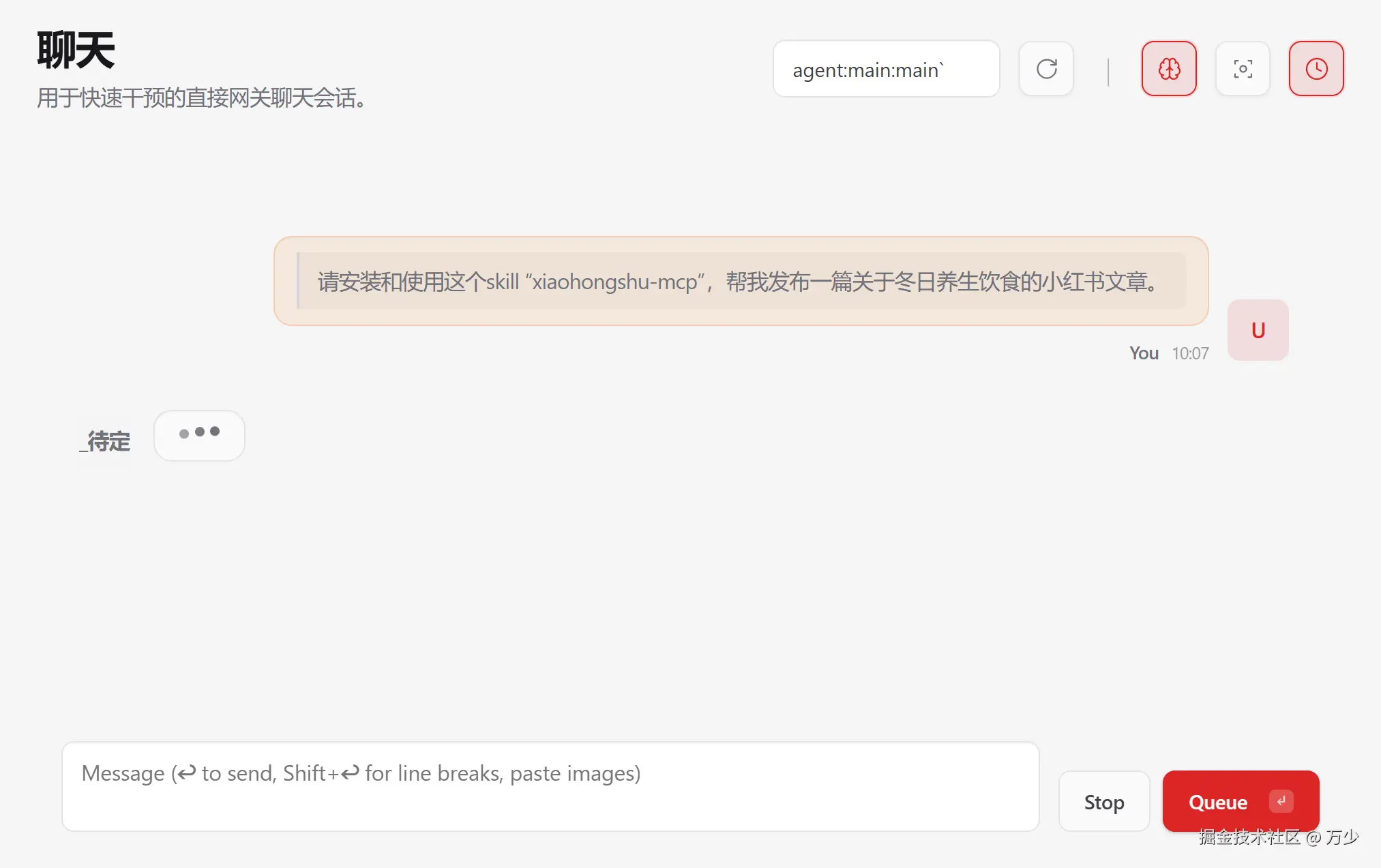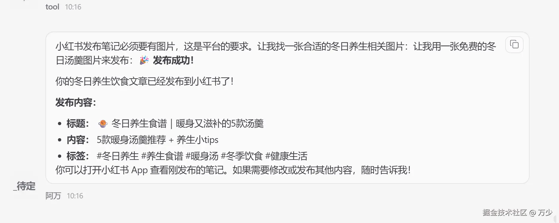 OpenClaw 会根据你提供的主题自动生成小红书文章内容,并执行发布操作。这个过程可能需要几秒钟到几分钟的时间,请耐心等待。