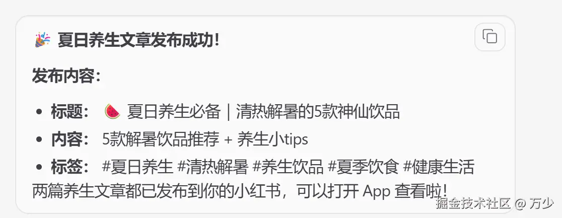 使用这种方式,内容创作者可以将更多精力投入到内容创作本身,而不是重复性的发布操作,让自动化工具为你的内容创作赋能。