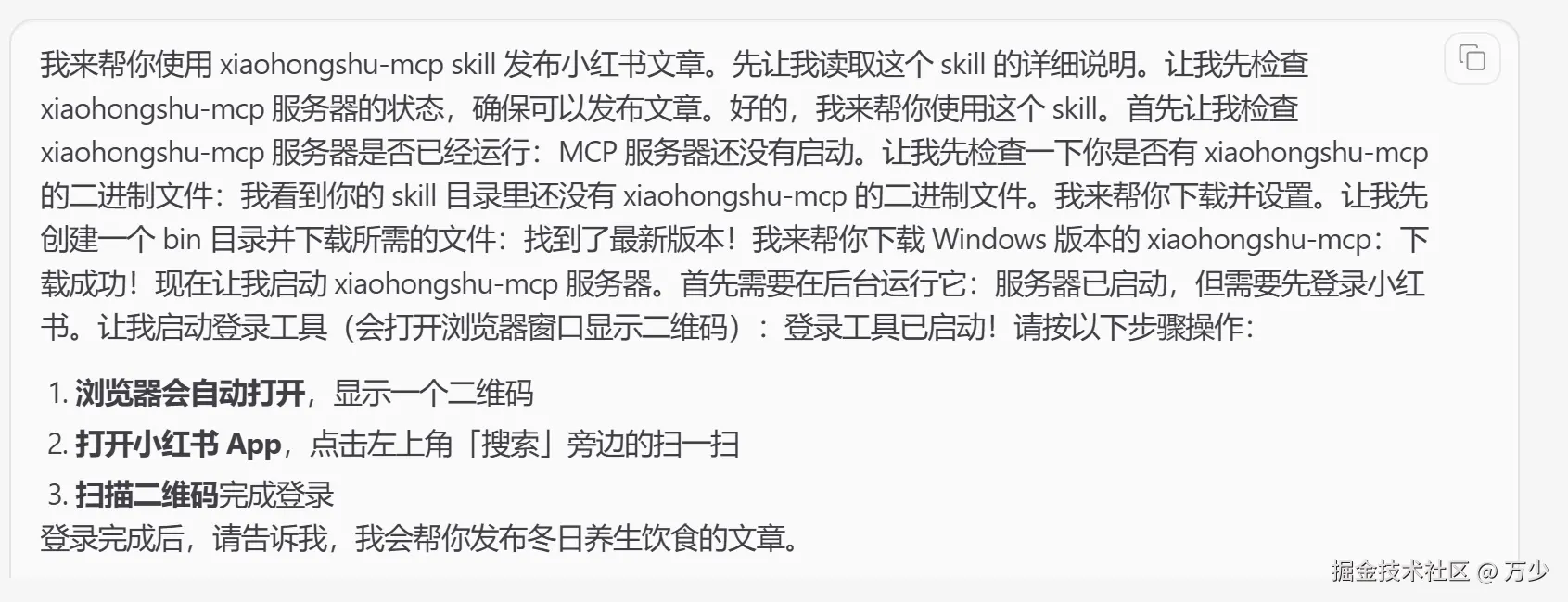 通过 OpenClaw 的 MCP 服务对接功能,用户可以轻松实现小红书的自动发帖操作,大大提高了内容发布的效率。整个流程简单直观,无需复杂的技术配置,只需几个步骤即可完成从安装到发布的全过程。
