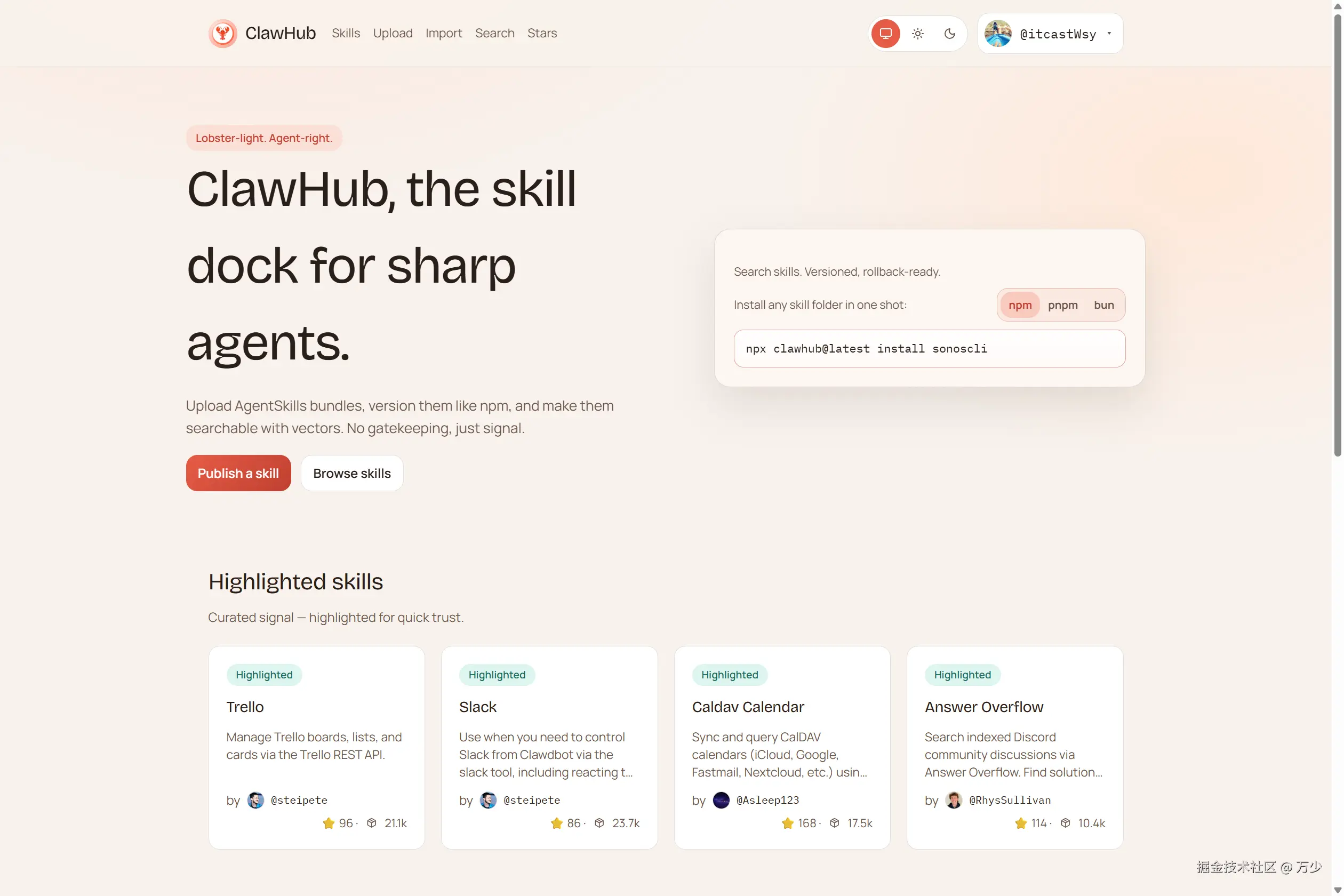 打开浏览器,访问 ClawHub 官方网站:clawhub.ai