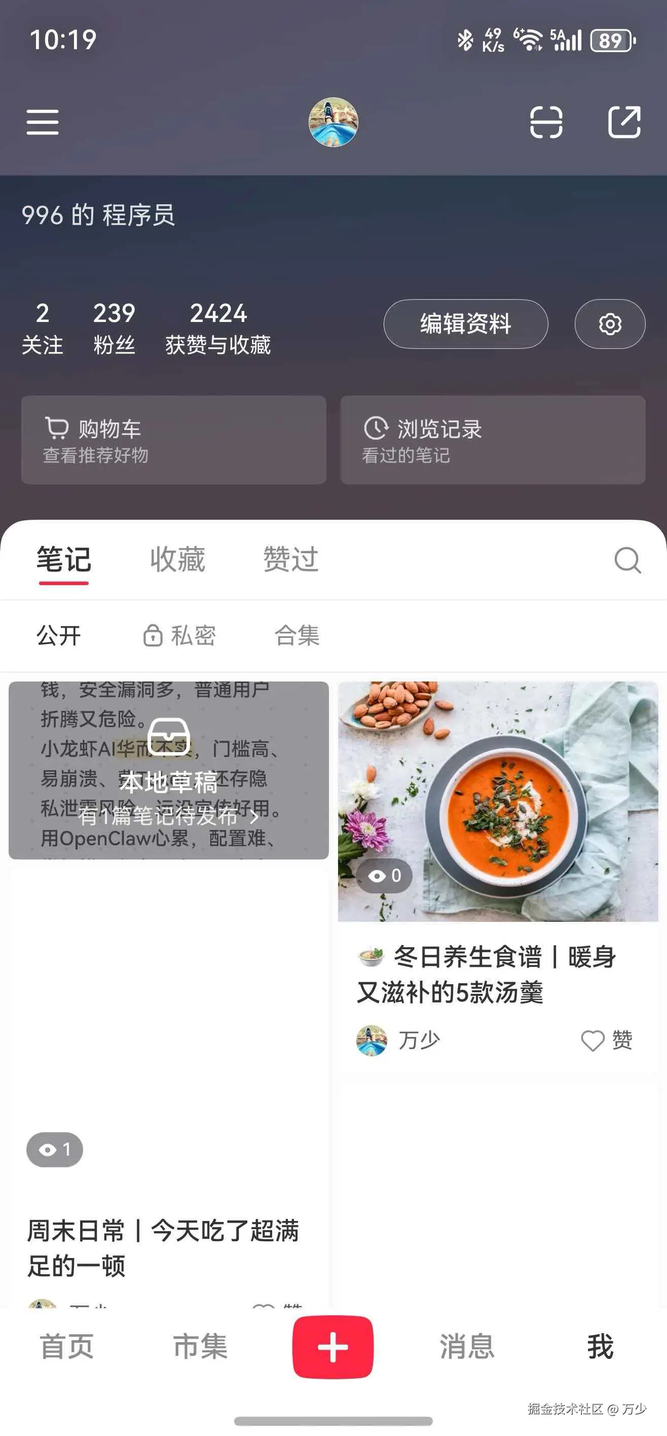 切换到小红书页面,查看个人主页,确认帖子是否已成功发布。