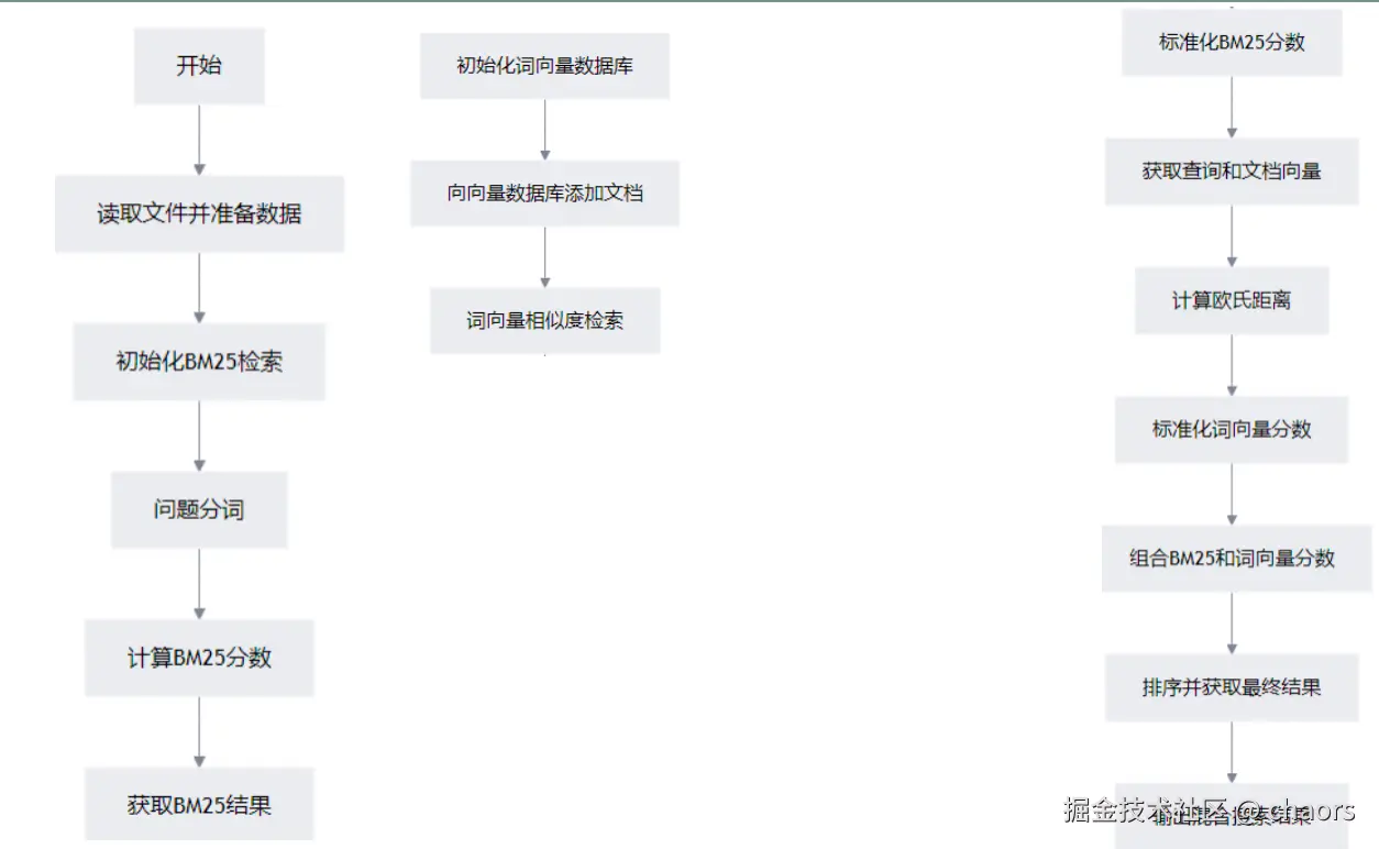 - vector_search 采用欧氏距离,因为数值越低,相关性越大。所以这里为了有可比性,需要用 1 减去归一化后的距离得到相似度分数 ,这样让vector_search结果和bm25_search一样,数值越高,相关性越大