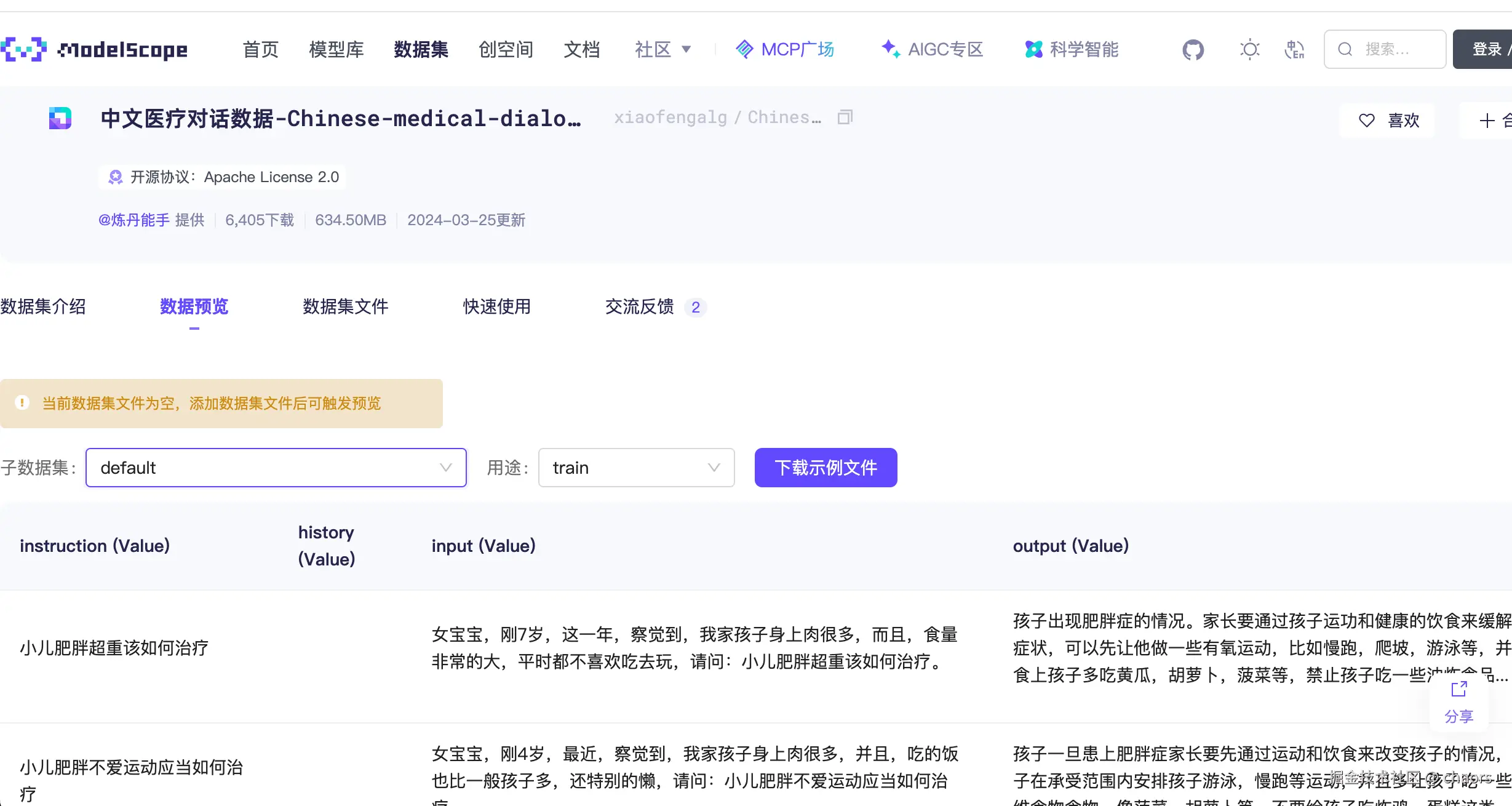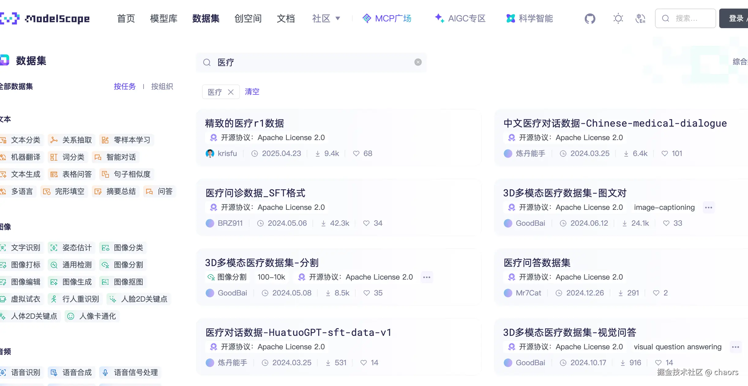 本次项目使用的是ModelScope上找的的一份医疗对话数据。首先,在ModelScope-数据集-搜索-"医疗"相关数据集: