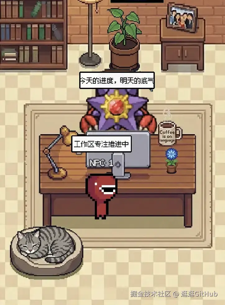 只不过风格是类似像素 RPG 的小办公室场景:有办公桌、沙发、咖啡机、服务器机柜、盆栽、海报、猫。