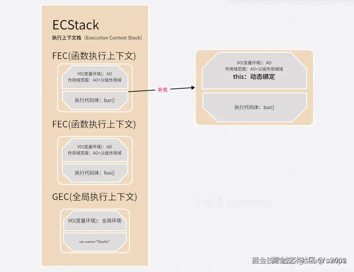 在函数执行上下文(FEC)中,除了作用域链、变量对象(AO)等,还包含 this 绑定。