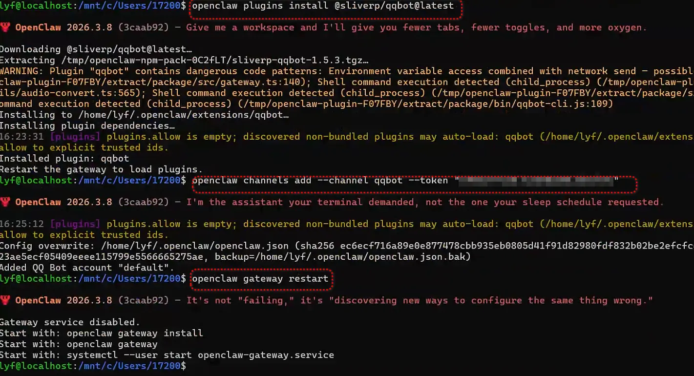 openclaw channels add --channel qqbot --token "你的AppID:你的AppSecret"