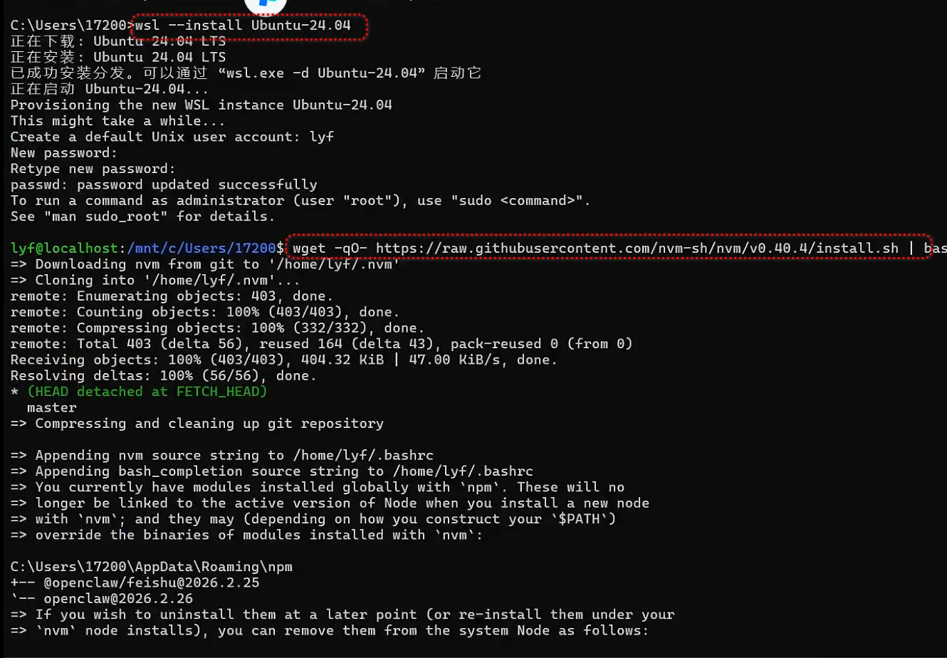 重启后再安装Ubuntu-24.04,安装好后需要输入账户和密码,然后就会进入 user@localhost这个开头的命令行,接着准备安装nodejs,这里使用nvm,这是一个nodejs管理器,非常好用,可以按照以下步骤进行安装: