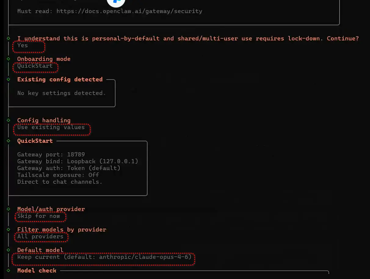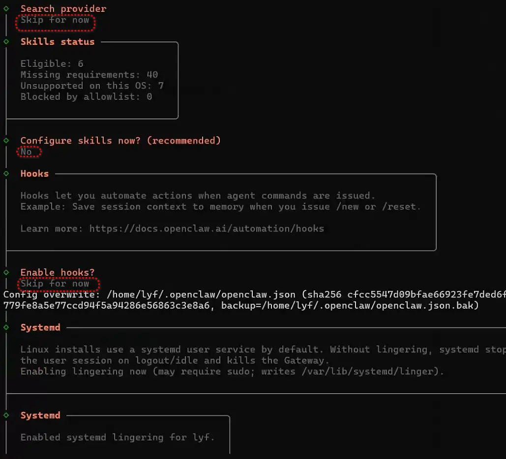 然后开始激活openclaw,执行下面的命令,这里我安装时候为了快速,很多选择跳过,因为这里我都是等后面再配置的,大家如果有其他模型可以按照提示,我这里给大家参考一下: