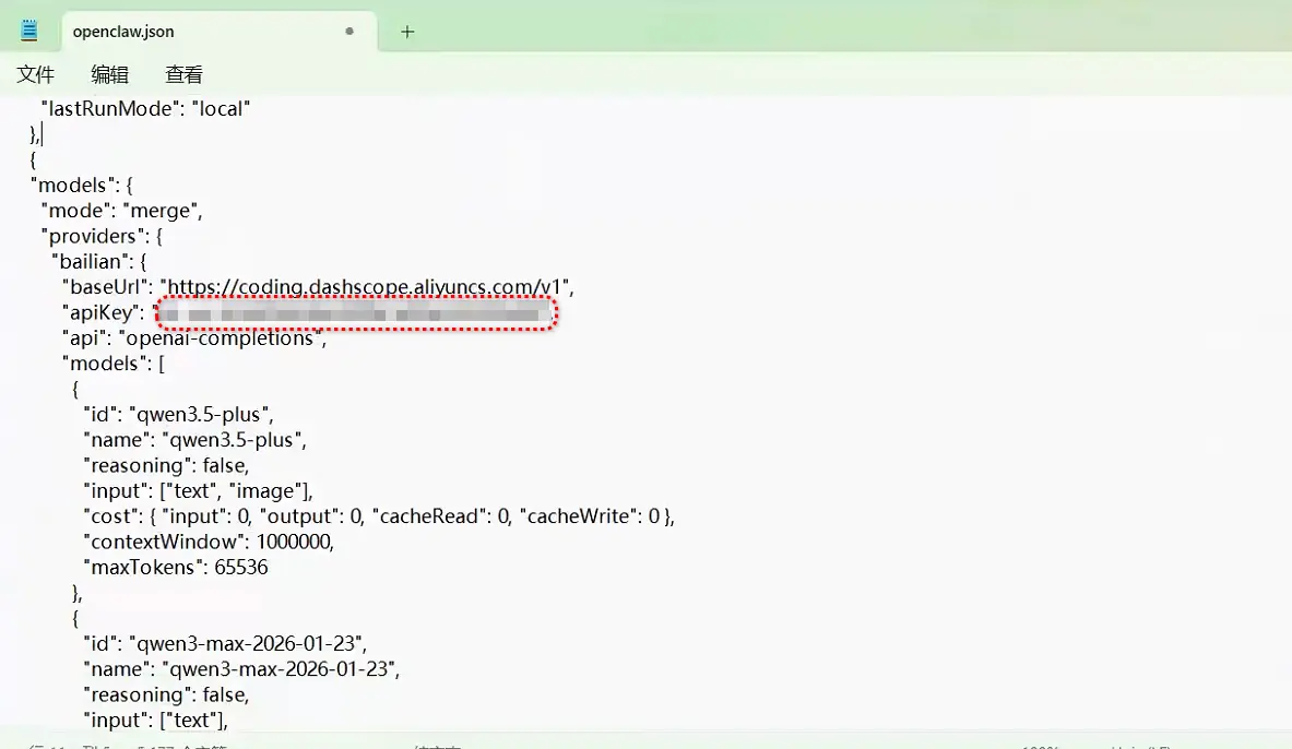 打开文件把模型替换,这个在每个平台里都有的演示模板的,文件挺长的我这里就不放出来了,需要的可以在文章最后看获取方法,替换apikey就可以了。 这里我使用的是阿里的coding plan计划,新用户才7块多一个月,使用下面链接可以领10元券: www.aliyun.com/benefit/ai/.....