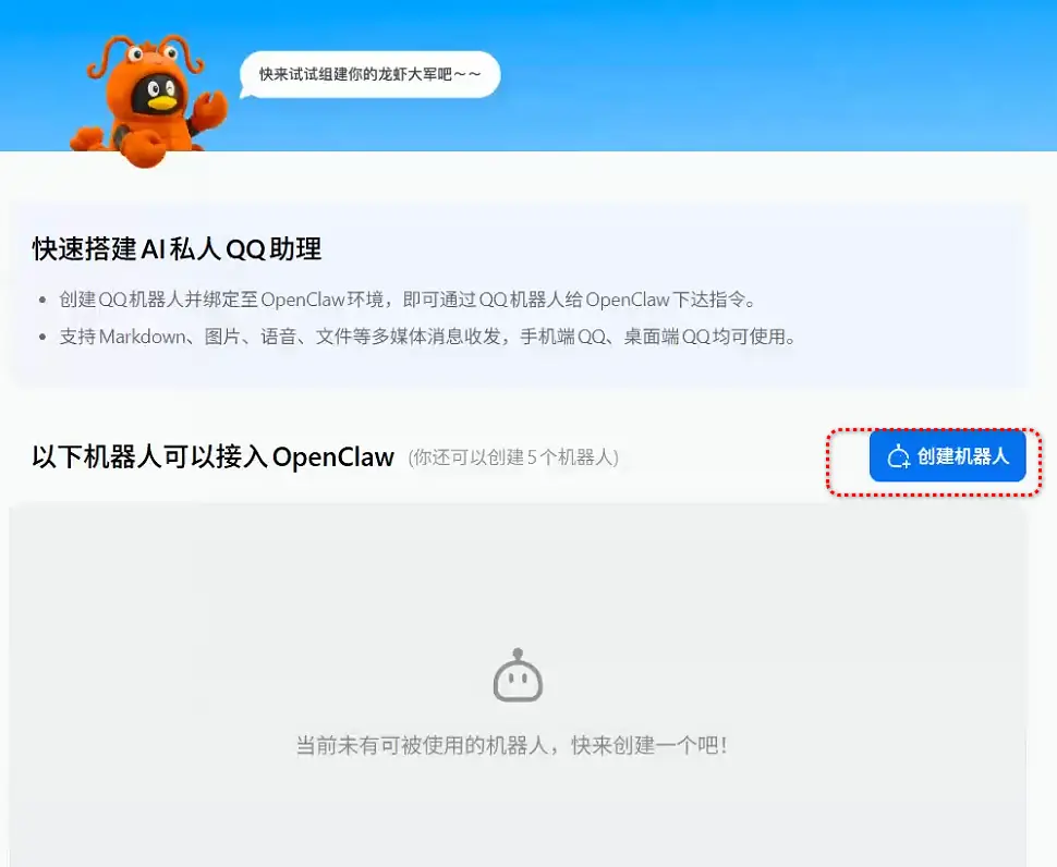 然后就会提示你创建机器人,现在QQ可以创建5个机器人,每个机器人可以绑定不同的Agent。