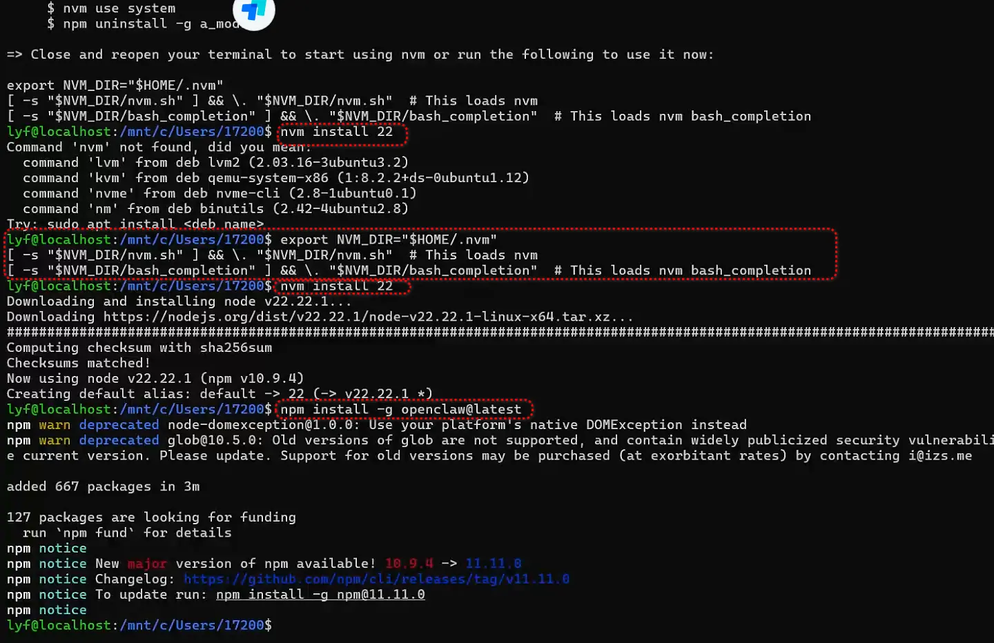 接下来就是用nvm安装nodejs,openclaw需要22版本以上的,所以下面执行下面的命令安装: