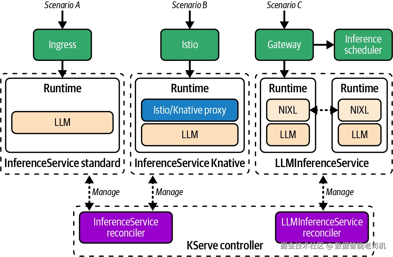 | 配置模板 | ServingRuntime 定义模型服务器模板 | LLMInferenceServiceConfig 定义带继承机制的基础 LLM 配置 |
