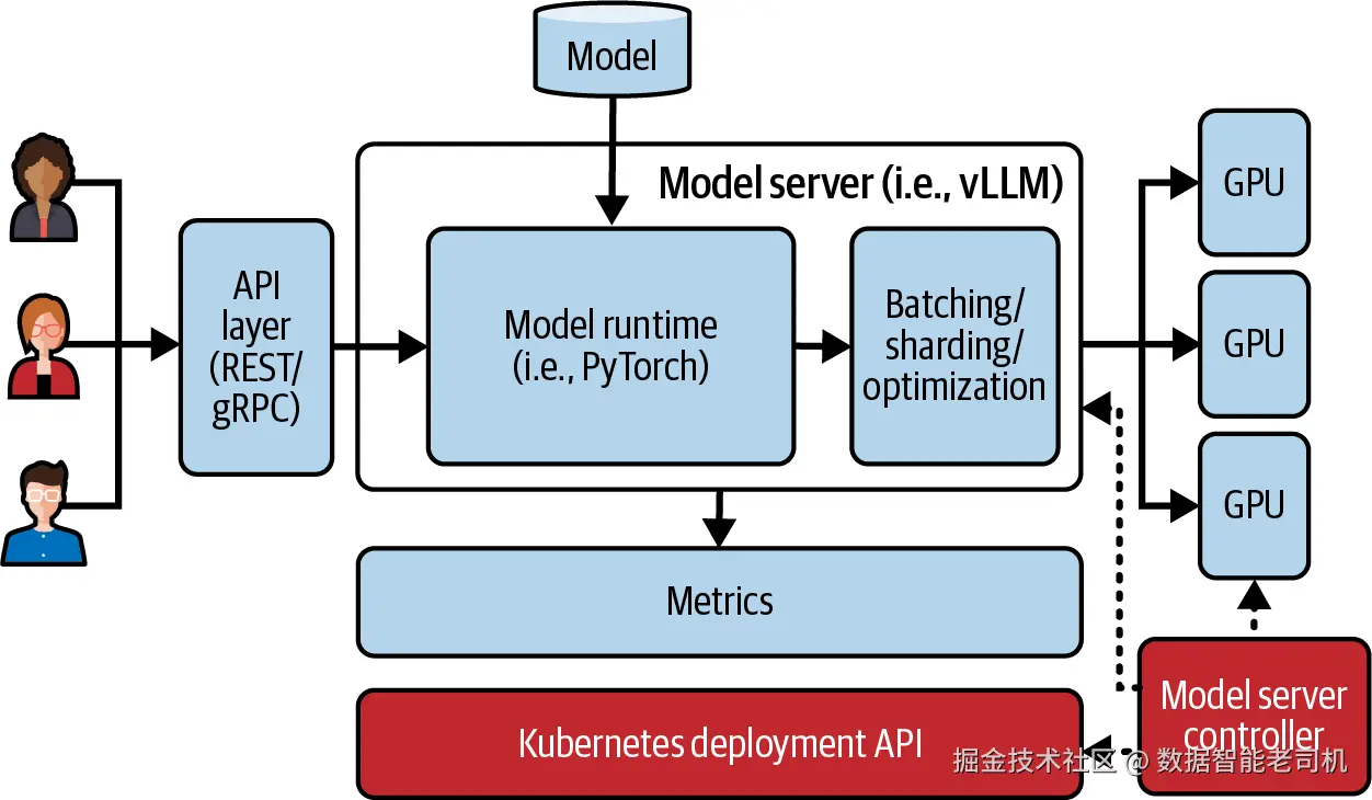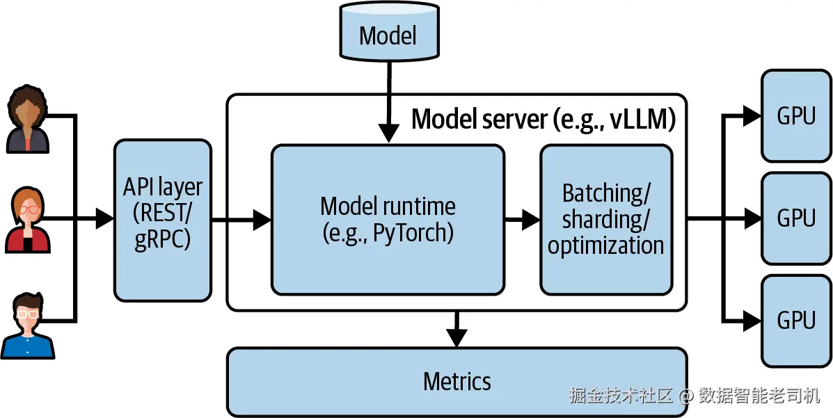 模型服务器(model server,或 serving runtime)是一个包含一个或多个运行时的组件。它可以分布式地同时使用多个 GPU,并执行多种类型的模型。模型通过 API(REST 或 gRPC)对外暴露,并被优化以最大化吞吐量、最小化延迟(见图 1-1)。