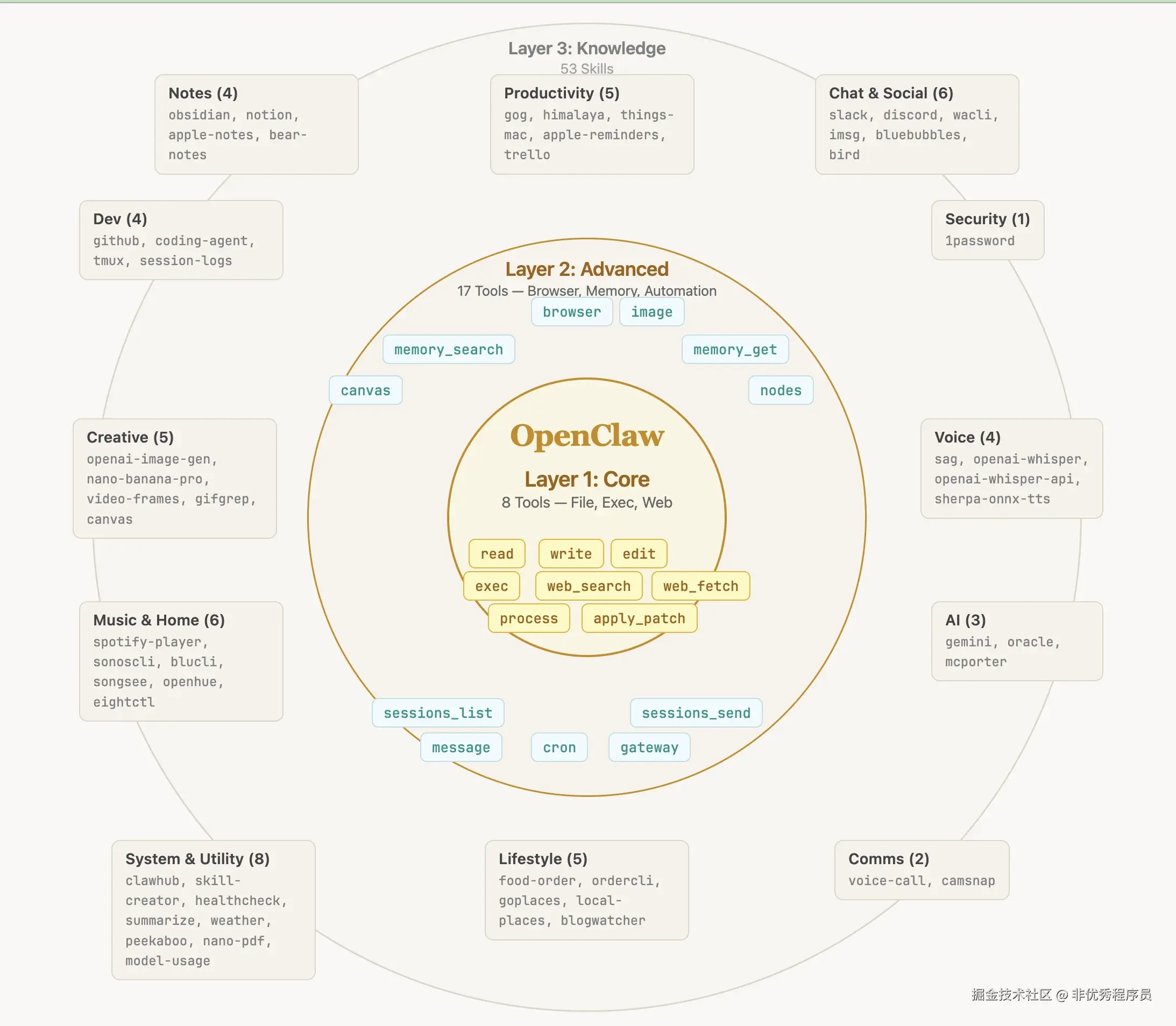 - 第一层核心能力(8项工具) :读写文件、执行命令、网络访问。几乎每个人都会上手。