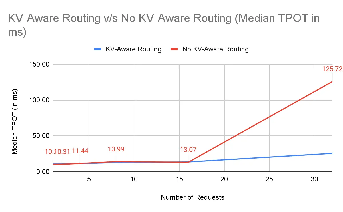 为什么 NVIDIA Dynamo 表现出色:Dynamo 将请求路由到大多数 KV 前缀已经缓存的 worker,避免冗余 prefill。即使在 高并发(32 个提示词)下,TTFT 优势也很明显。