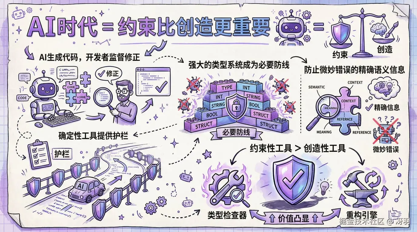 强大的类型系统、可靠的重构工具和准确的语义模型成为必不可少的护栏。它们提供了允许 AI 输出被审查、验证和有效纠正而不是盲目信任的结构。