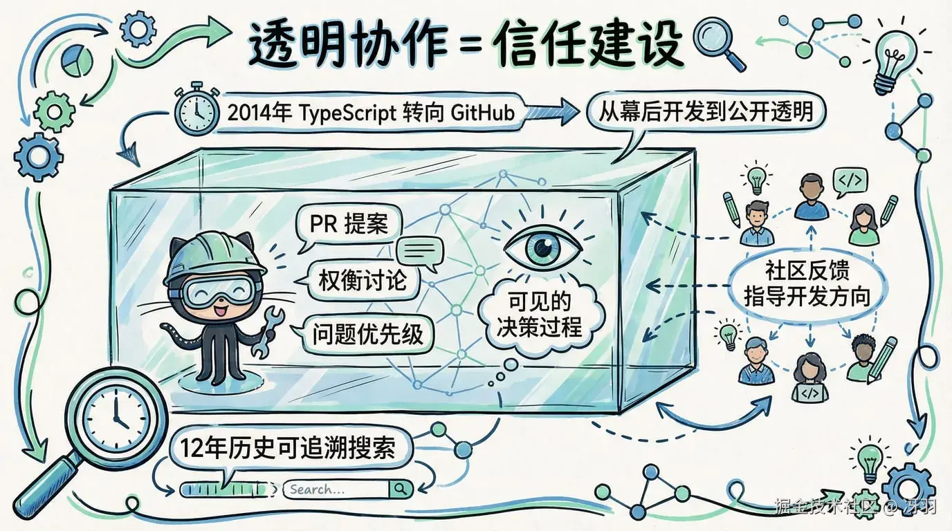 TypeScript 团队在 2014 年做了一个重要决定:完全开放开发过程,所有讨论都在 GitHub 上进行,让全世界都能看到他们是怎么做决策的。