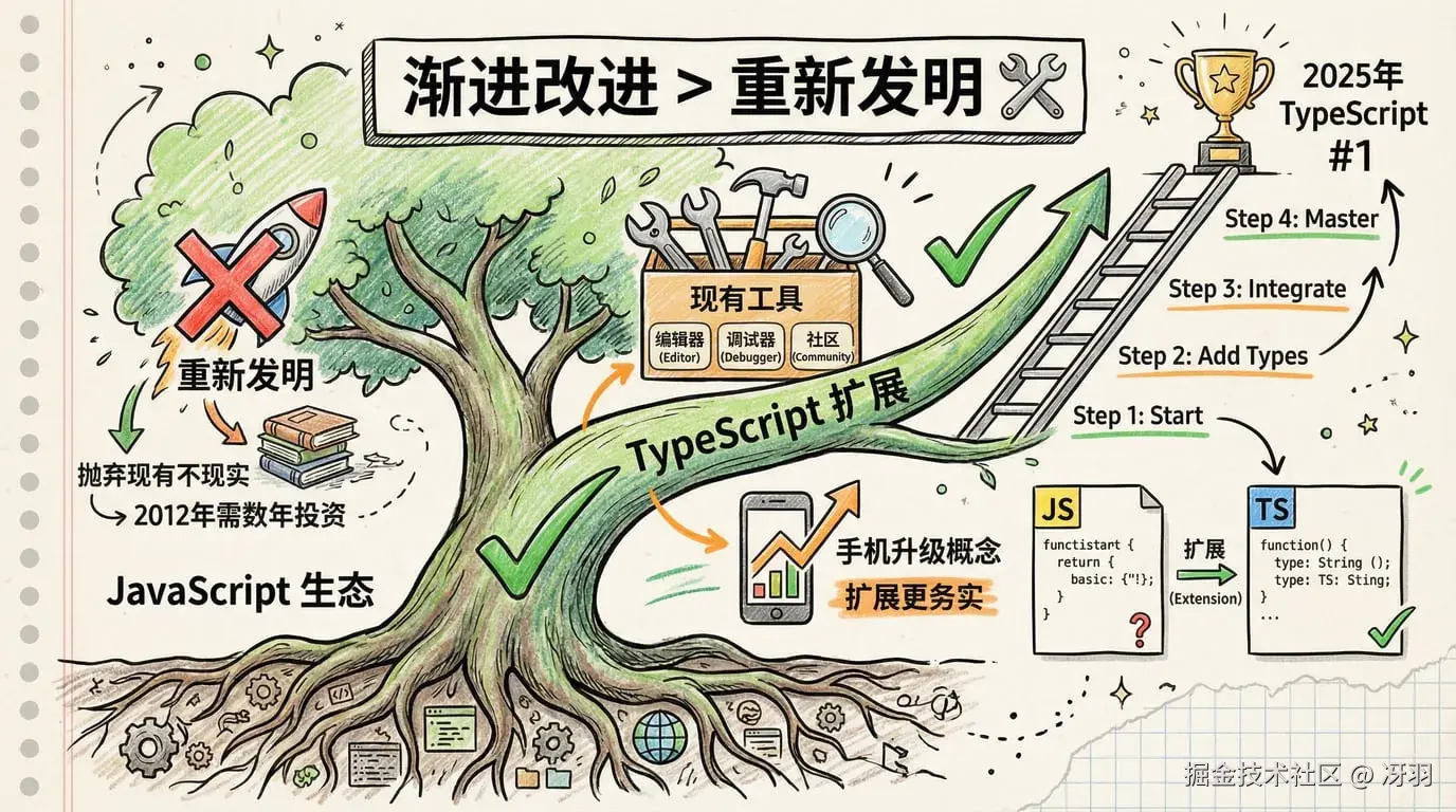 不是因为它比 JavaScript 更"完美",而是因为它选择了"扩展"而不是"替代"。