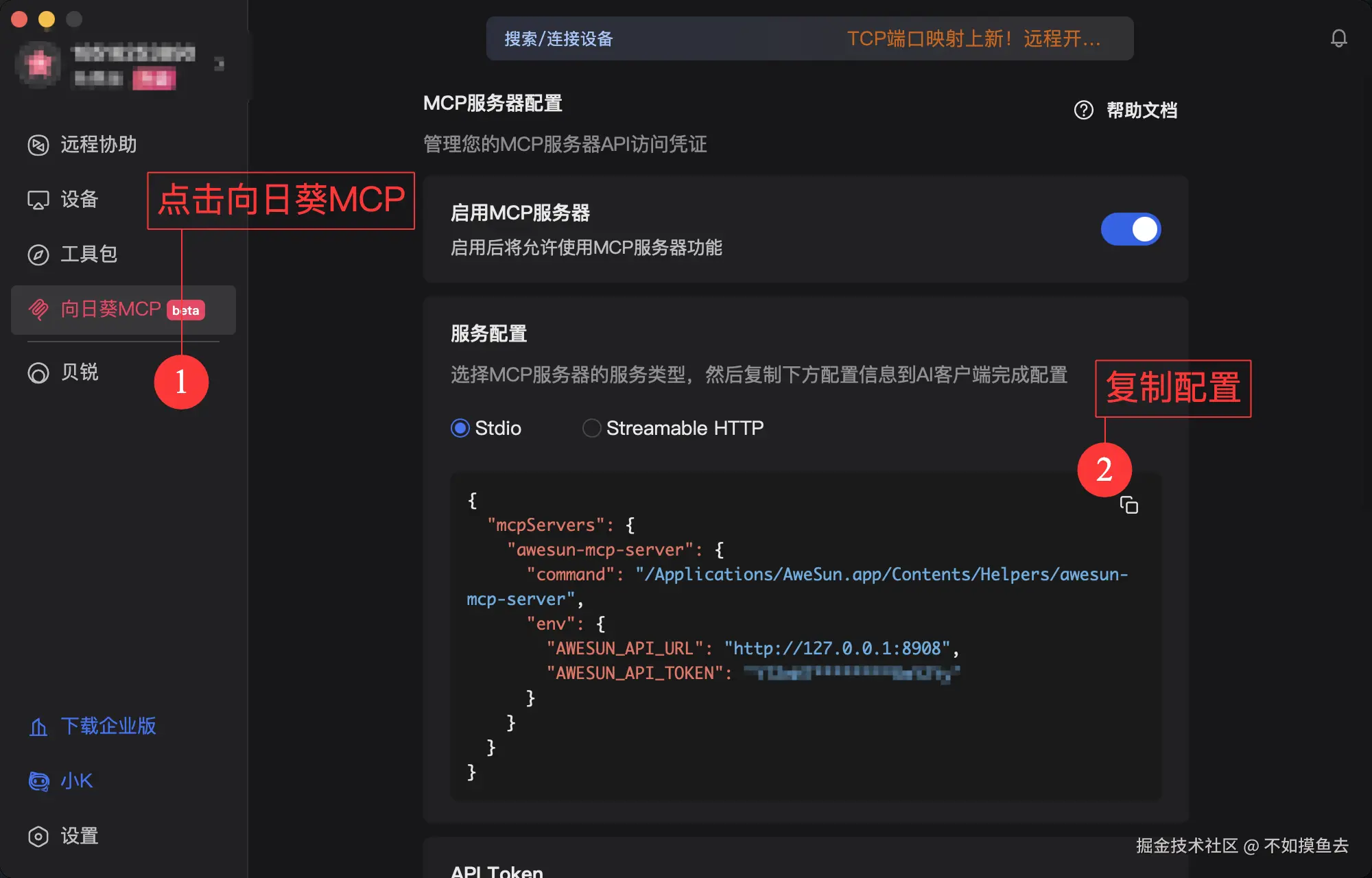 安装向日葵后,按照下图获取 mcp 相关配置: