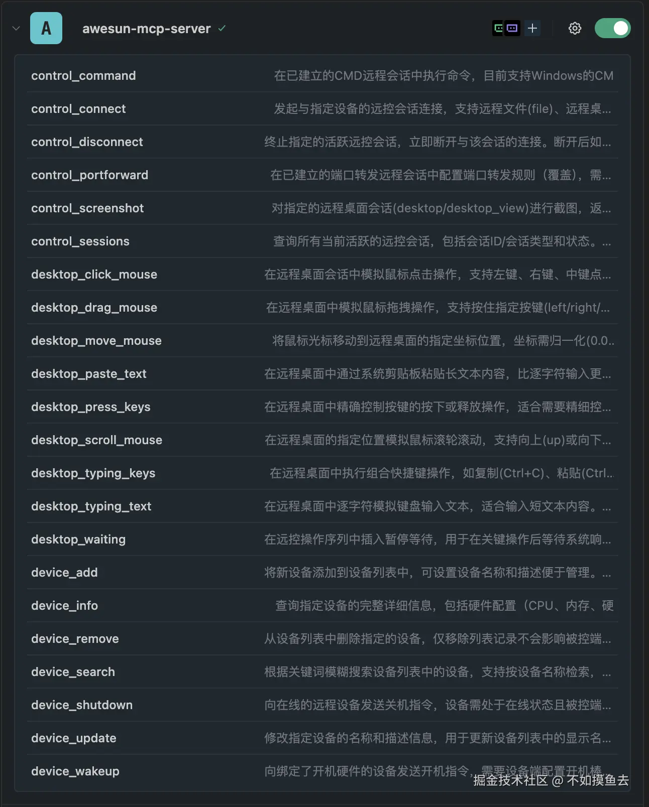 配置完成后我们可以看到向日葵提供了二十多个工具,这是 AI 可用的工具集,见下图:
