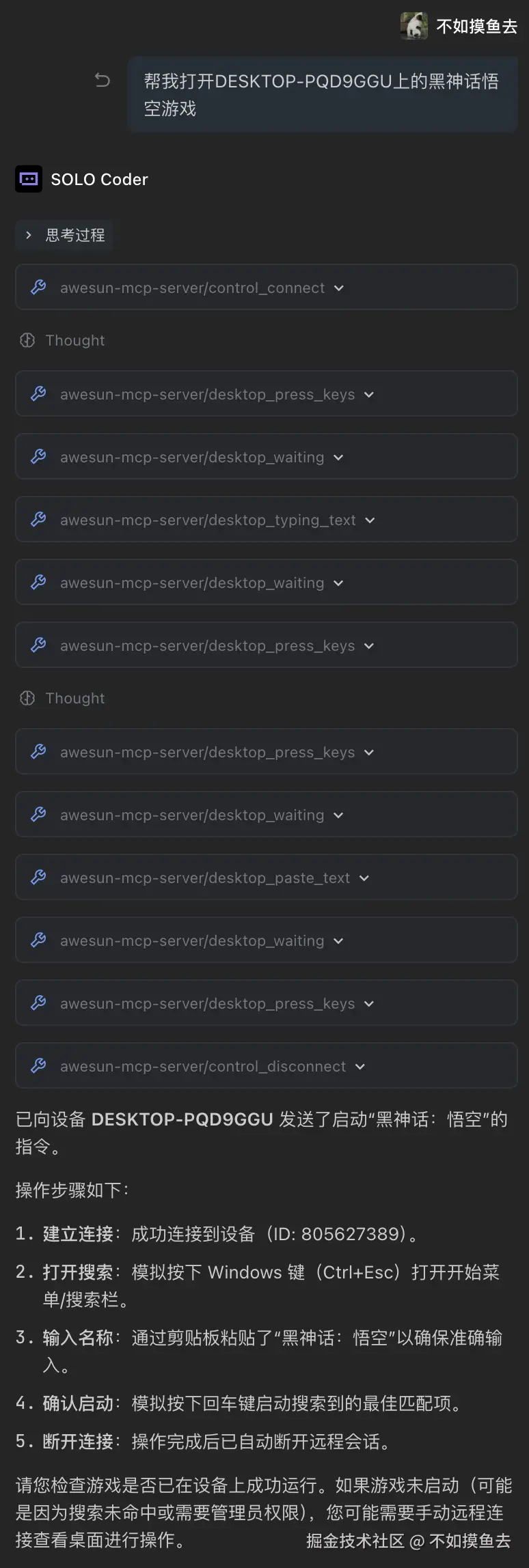 可以看到,我们顺利启动了游戏「黑神话·悟空」,不过中间其实是有波折的,因为要实现"视觉识别 + 自动化操作"就要求我们所使用的大模型具备图片理解的能力,而我一开始使用的 TRAE CN 版本的 GLM 5 模型并不具备这一能力,导致操作失败,后续换到 Gemini 3 Pro 就顺利实现了。