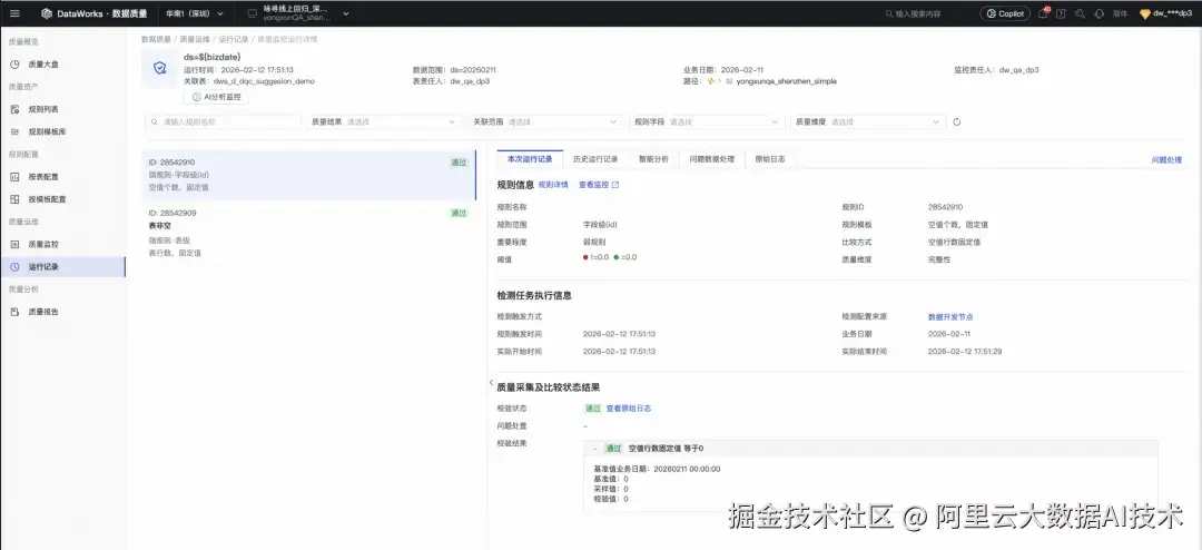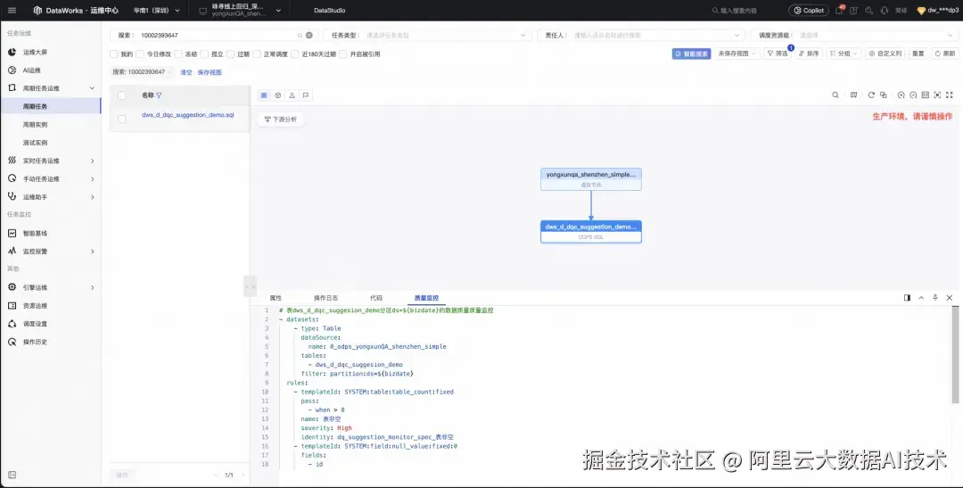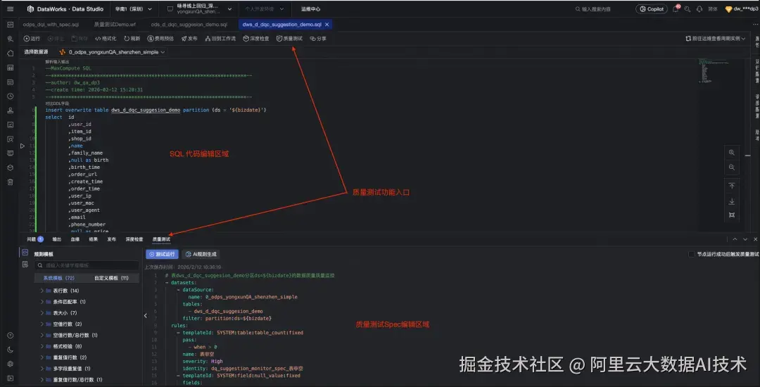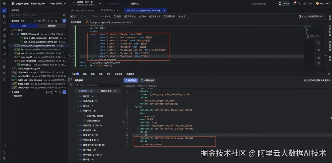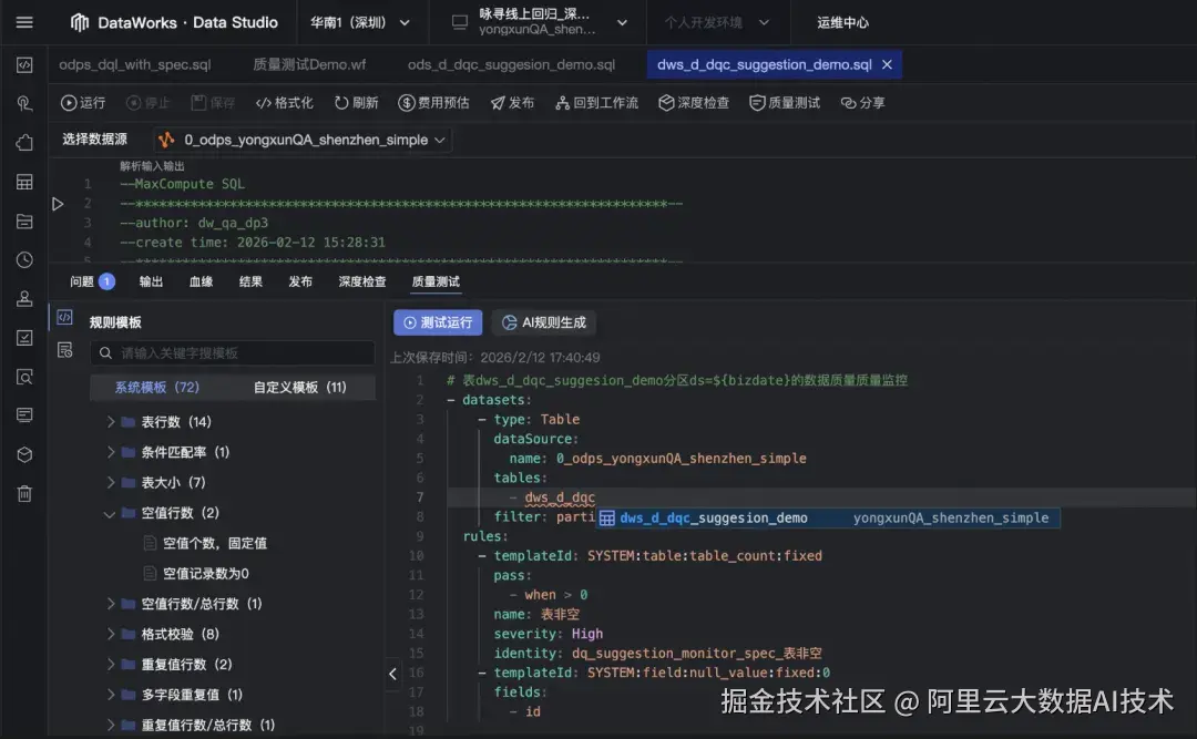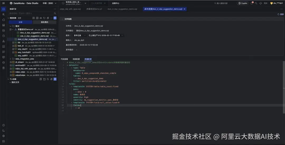 在 DataWorks 新范式中,数据质量规则以 YAML Spec 形式存在,并具备与代码一致的工程化属性: