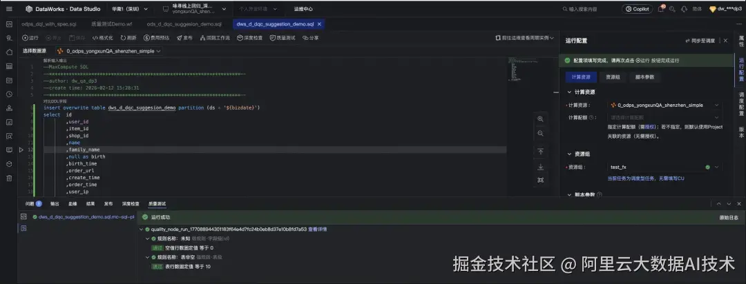当前能力已支持 MaxCompute SQL;其他类型 SQL 正在推进中,目标包括 EMR、Hologres、StarRocks 等,让不同引擎在质量能力上获得一致体验。