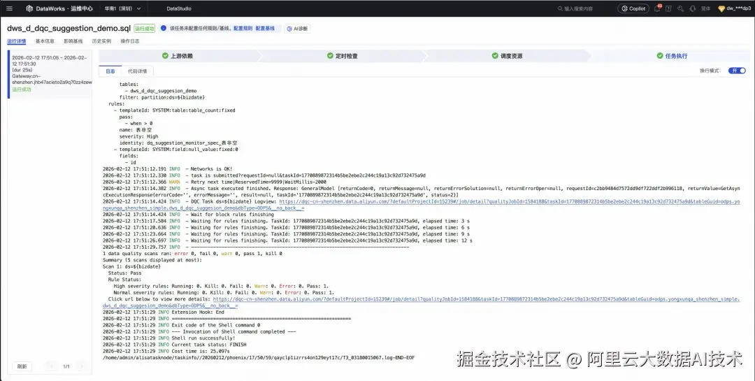 上线后,生产调度会自动执行规则,你可以查看扫描日志与结果: