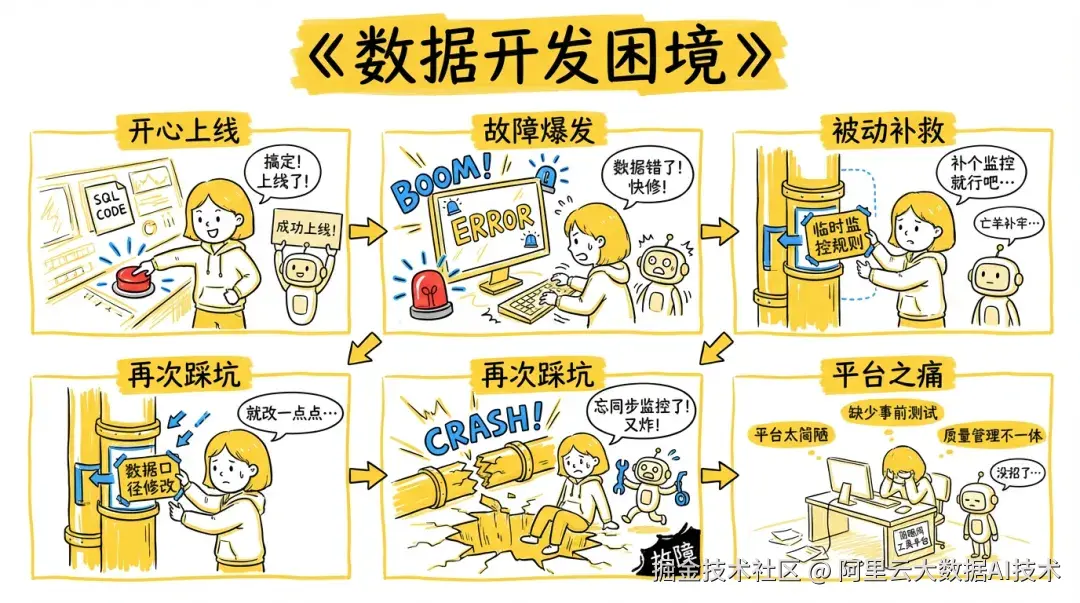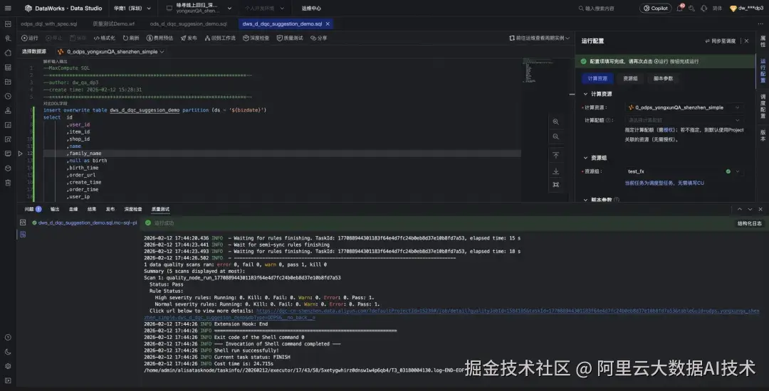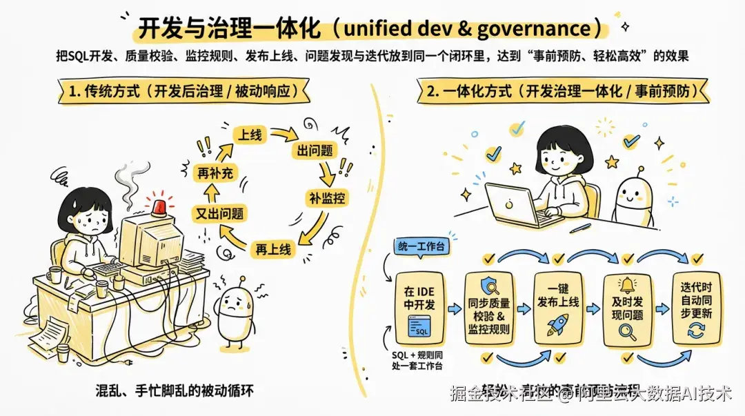 对于开发者而言,离线数据开发中数据质量建设的核心挑战,从来不是"能否配置规则",而是:质量规则能否像代码一样低成本、高可靠地融入研发交付全流程。 当质量规则游离于开发链路之外,治理便退化为被动补救:SQL上线后补配质量规则、字段变更引发误报漏报、规则与代码版本脱节......最终导致规则越配越多,忙于补救的恶性循环。