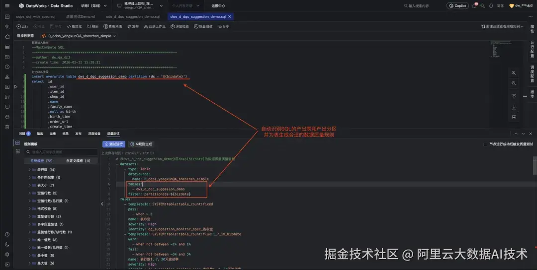 Spec 的书写相对于表单式的配置门槛更高些,这里建议通过 DataWorks Agent 对话式的方式让 AI 辅助生成 Spec,AI 辅助生成时会感知 SQL 写入的表和分区,并生成合适的数据质量规则。
