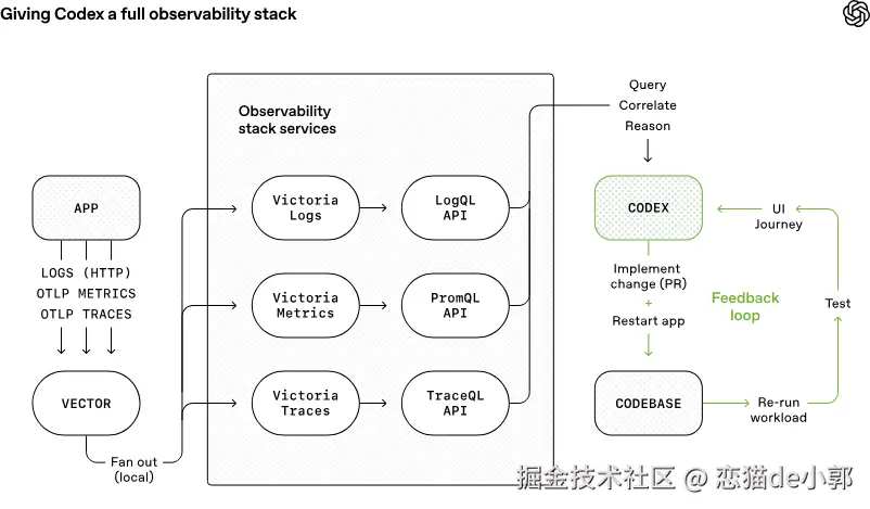 在 OpenAI 这个项目里,项目的日志、指标和追踪信息通过一个本地可观测性堆栈暴露给 Codex,这个堆栈对于任何给定的Worktree 都是临时场景。