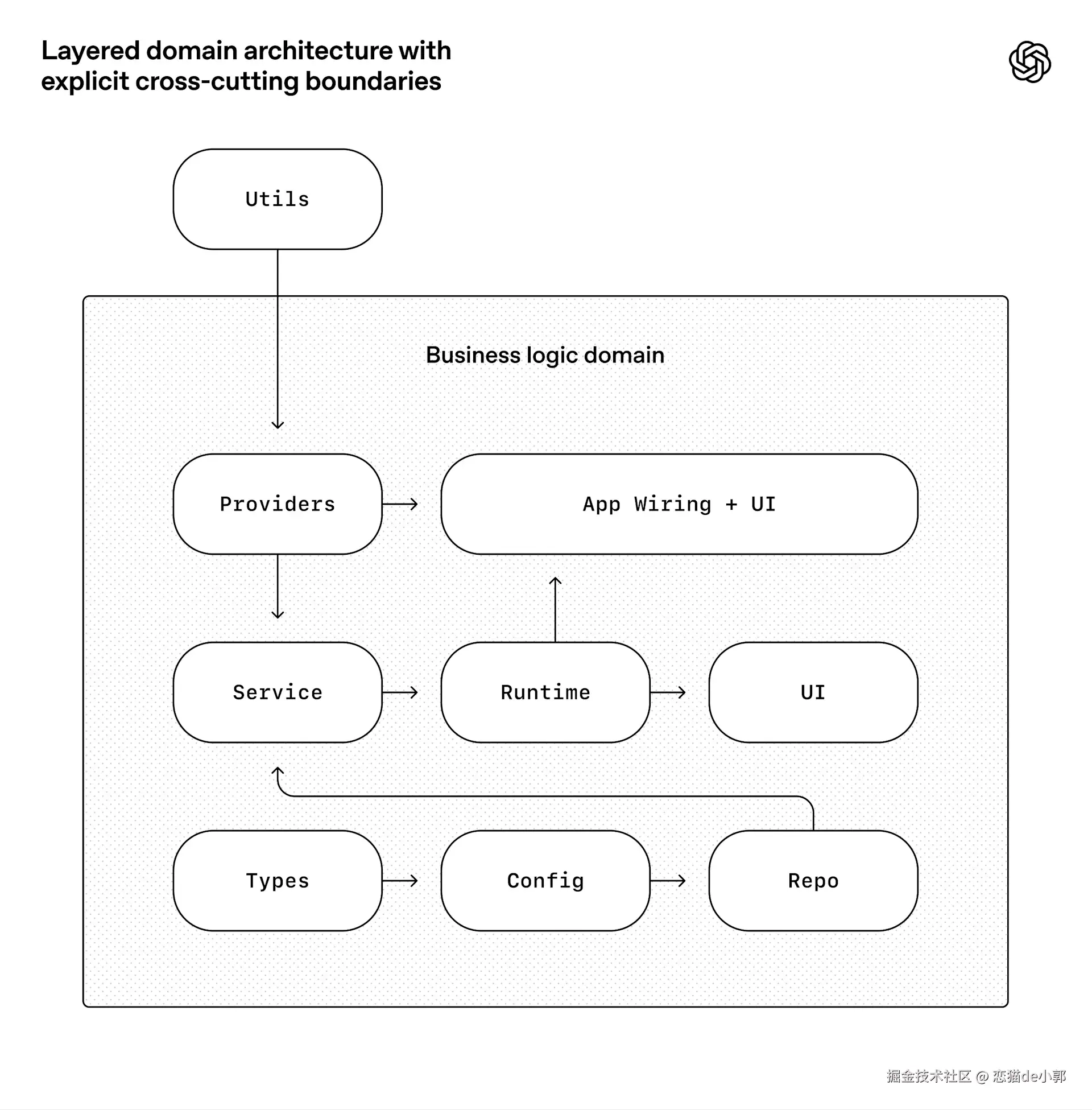 在每个业务领域(例如应用设置)内,代码只能通过一组固定的层级(类型 → 配置 → 存储库 → 服务 → 运行时 → 用户界面)进行"前向"依赖,而横切关注点(身份验证、连接器、遥测、功能标志)通过一个明确的接口Providers 进入,任何其他方式都被禁止,并且会强制执行。