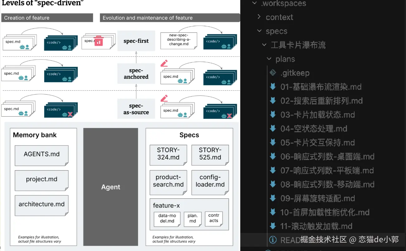 另外你是在单纯 Prompt AI 还是管理 AI 工程,整个生产体验也会不一样,用 AI 不是说完几句话就可以不管等结果,比如常见的 SDD (Spec-Driven Development)的开发管理方式,它就需要很多文档来进行迭代、记录和索引: