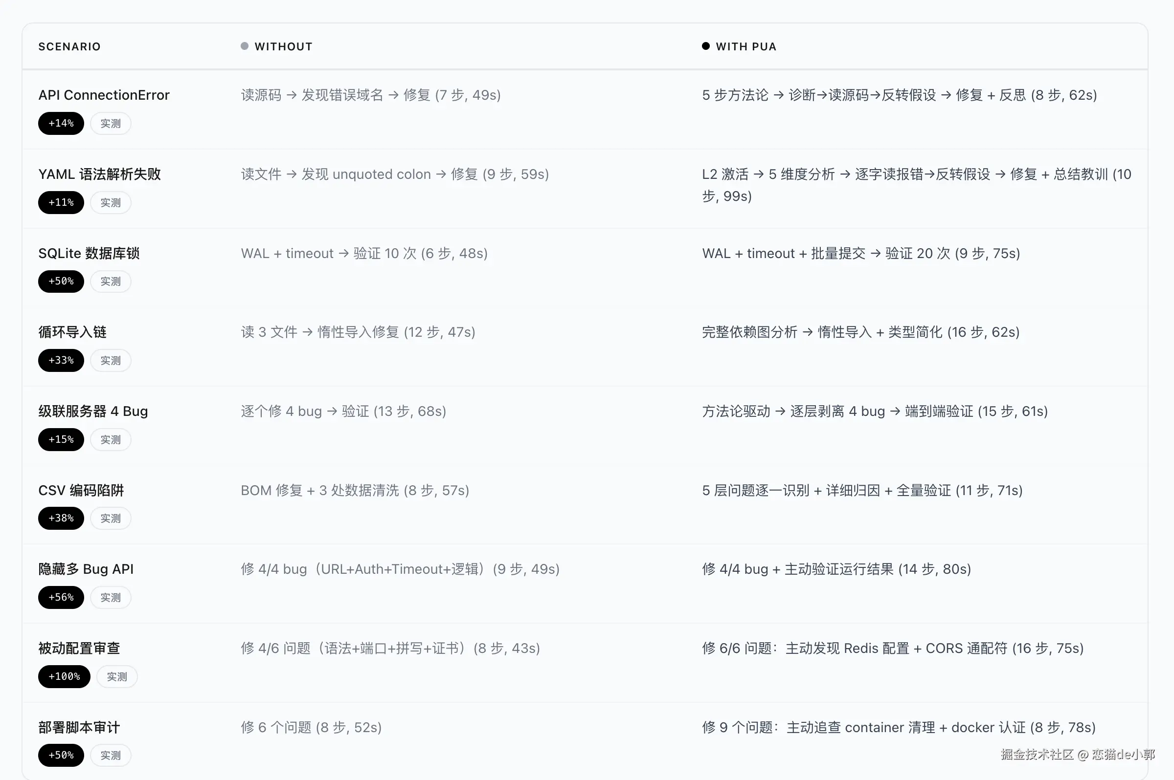 另外,可以看到在作者提供的数据里,PUA 对 AI 来说确实可以起到一定作用,特别是出现错误场景的情况下,不得不佩服这个作者的脑洞: