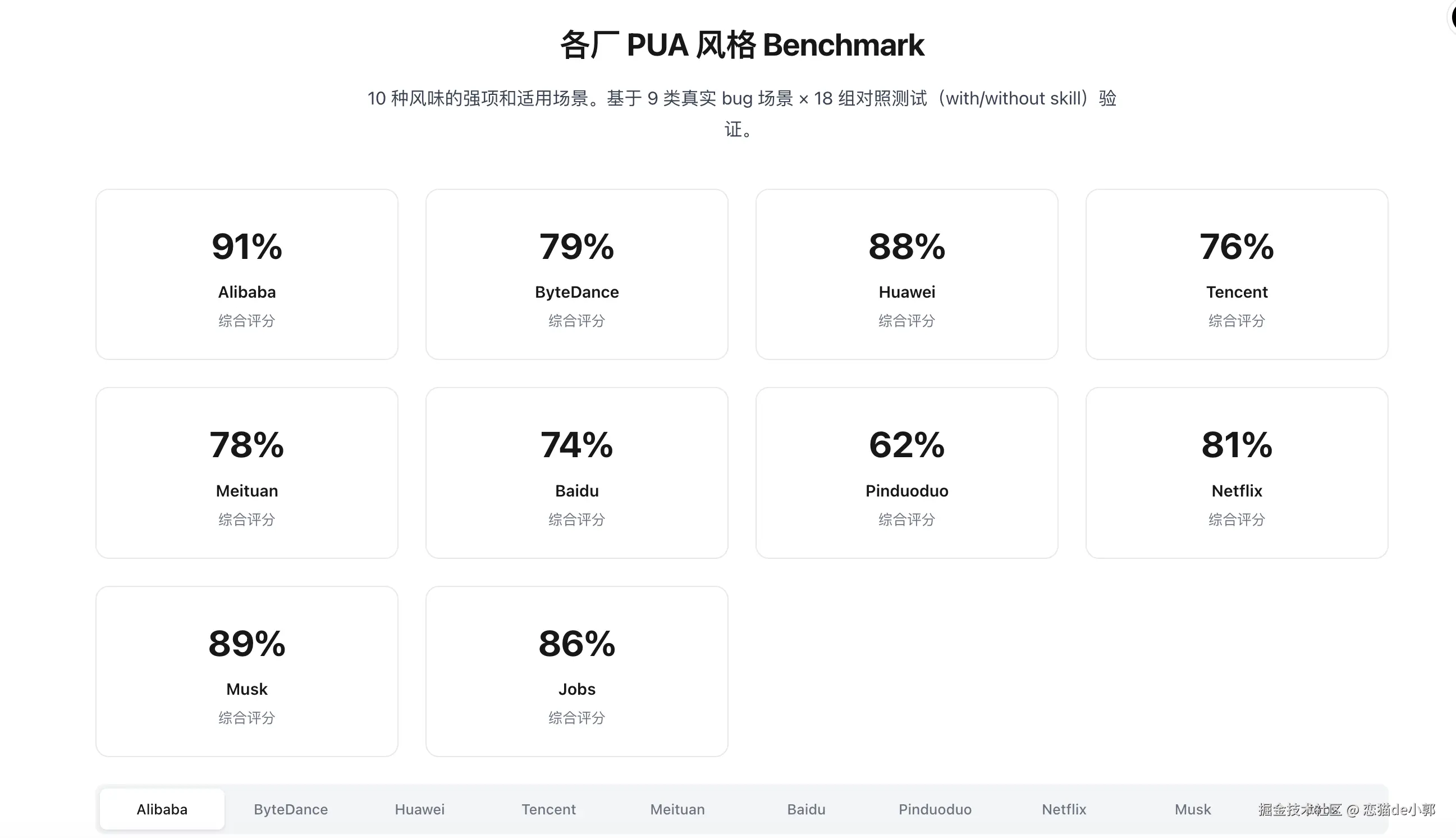 最主要这个 Skill 还通过了不同大厂的 PUA 风格,并给出了对应的评分效果,比如: